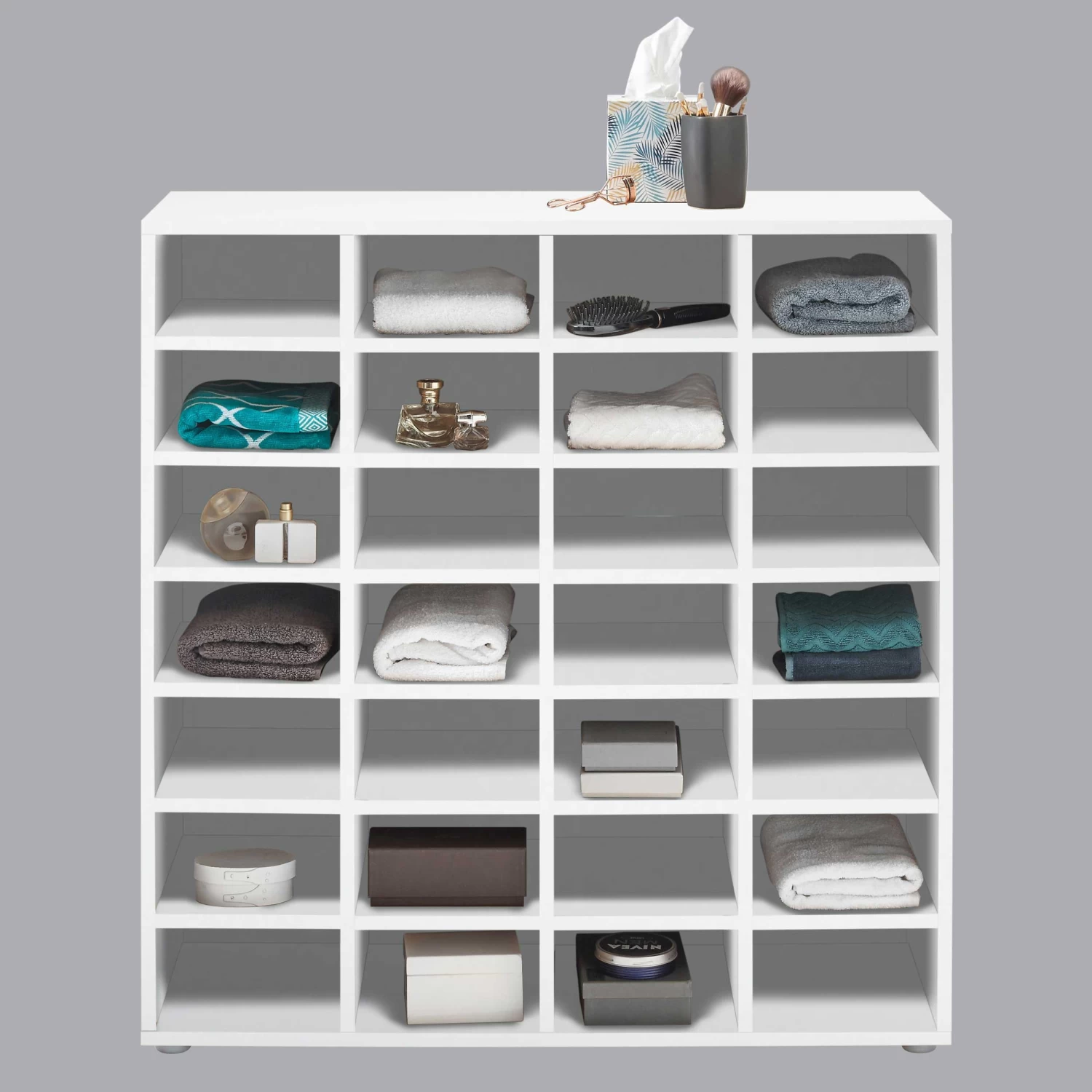 Opbergrek Zapa met 28 vakken. Gemaakt uit witte spaanplaat.