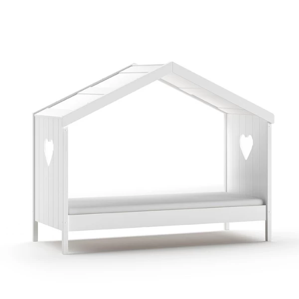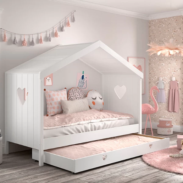 Bedhuisje Amori, geschikt voor een matras van 90×200 cm. Gemaakt uit massief grenen en MDF. Inclusief lattenbodem en bedlade. Met romantische details.