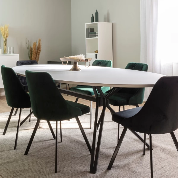 Ovale eettafel Imagine spreekt tot de verbeelding door de speelse vorm van zijn metalen poten. De ovale vorm van het tafelblad geeft het meubel een zachte uitstraling. De tafel is ideaal voor dinertjes tot en met 8 personen. Bekijk gerust onze website voor bijpassende stoelen!