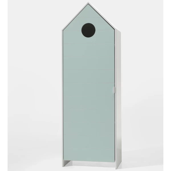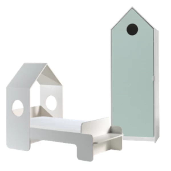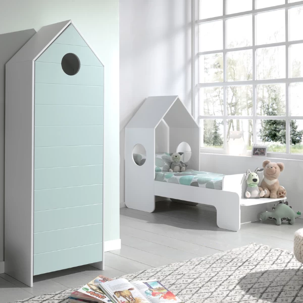 Peuterkamer Casami bestaat uit een kleerkast 58x172x37 cm en een bedhuisje van 70×140 cm (matras van 70×140 cm niet inbegrepen). De kamer is gemaakt uit wit en muntgroen gelakt MDF.