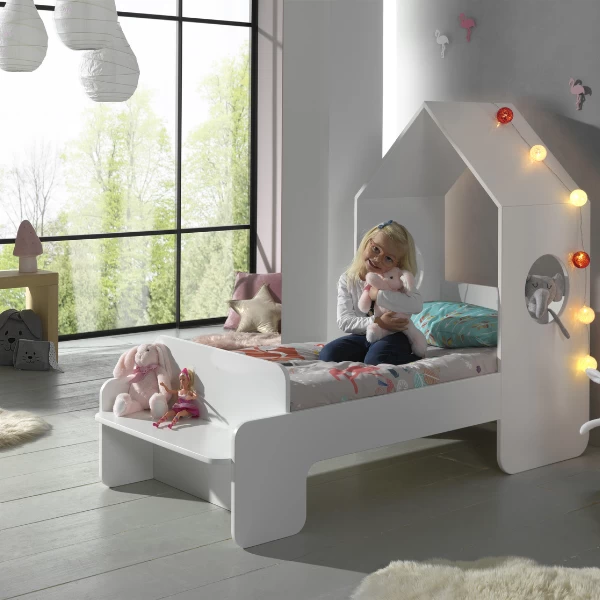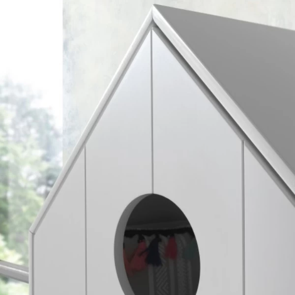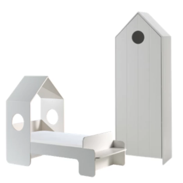 Peuterkamer Casami bestaat uit een kleerkast 58x172x37 cm en een bedhuisje van 70×140 cm (matras van 70×140 cm niet inbegrepen). De kamer is gemaakt uit wit gelakt MDF.
