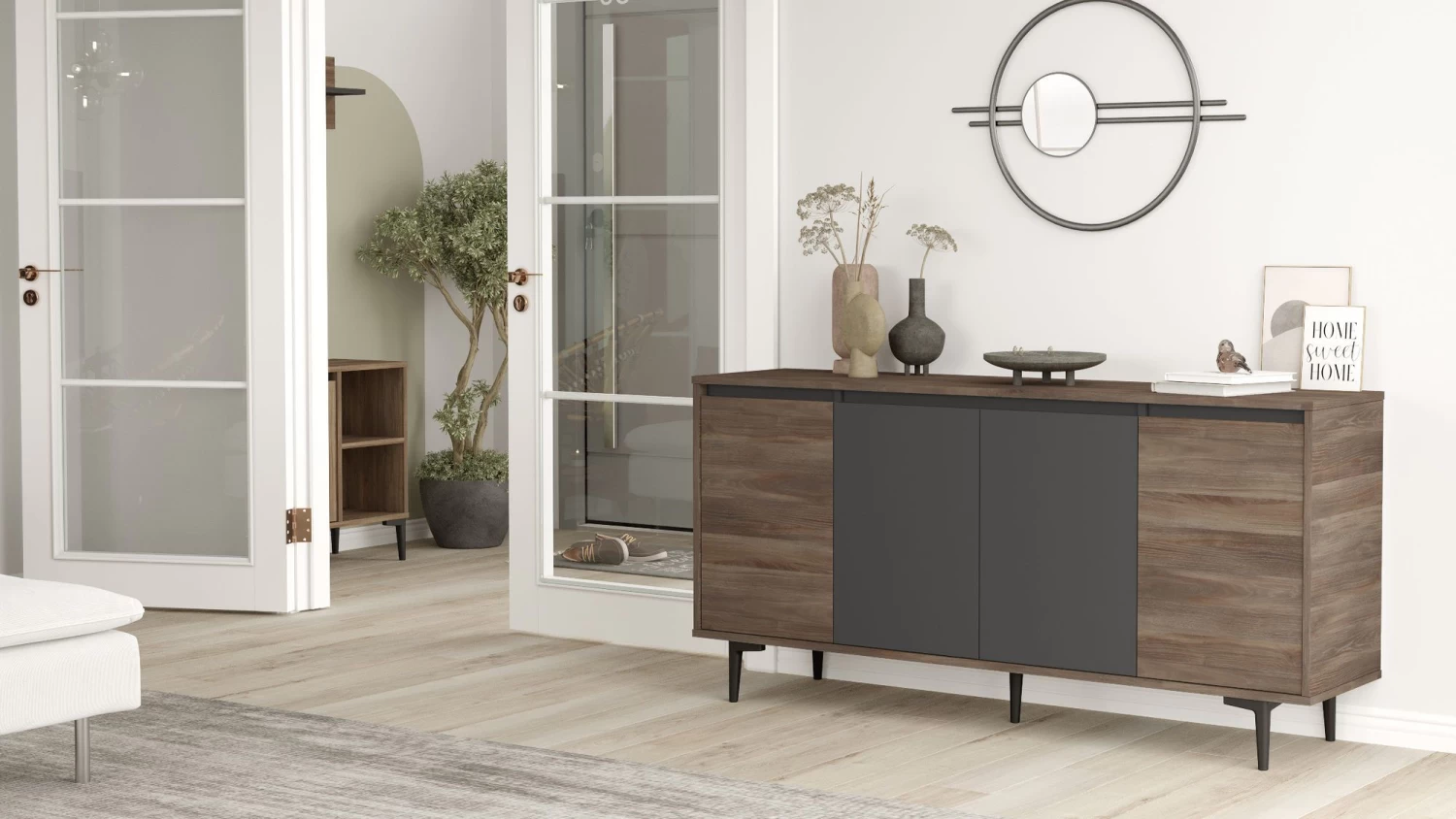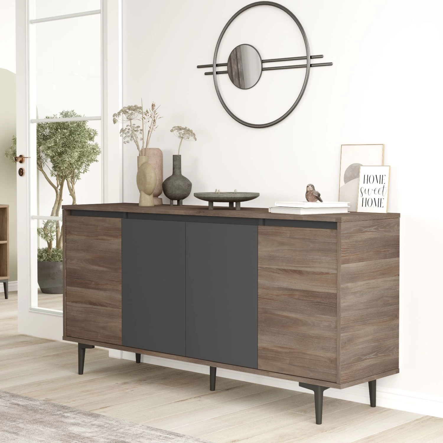 Maak kennis met de Locelso Console, een stijlvolle en functionele aanvulling voor elk huis of kantoor. Deze console is gemaakt van 100% gemelamineerd spaanplaat en is ontworpen met het oog op duurzaamheid en een lange levensduur, zodat hij jarenlang een vast onderdeel van je interieur zal blijven.Een van de opvallende kenmerken van de Locelso Console is zijn dikte. Met een dikte van 18 mm laat deze console zijn robuuste constructie zien en biedt hij een stevige basis voor al je waardevolle spullen. Of je hem nu wilt gebruiken als display of voor opslagdoeleinden, de Locelso Console kan het allemaal met gemak aan. De console is uitgerust met kunststof poten, die een extra vleugje eigentijdse stijl toevoegen aan het algehele ontwerp. Deze poten dragen niet alleen bij aan de esthetische aantrekkingskracht van de console, maar zorgen ook voor stabiliteit en ondersteuning. Met een breedte van 160 cm en een hoogte van 78 cm biedt de Locelso Console voldoende ruimte om je decoratie, foto’s of zelfs je werk op te zetten en uit te stallen. Het royale formaat maakt het geschikt voor verschillende doeleinden, zodat je je ruimte kunt personaliseren en optimaliseren op basis van je voorkeuren. De Locelso Console versterkt je interieur en heeft een fascinerende kleur – een geraffineerde mix van bruin en antraciet. Deze combinatie creëert een strakke en moderne visuele esthetiek, die moeiteloos past bij elke bestaande interieurstijl. Of je nu een hedendaags, industrieel of traditioneel ontwerpthema hebt, deze console past naadloos in je ruimte. Naast zijn esthetische aantrekkingskracht biedt de Locelso Console ook tal van voordelen. De 100% melamine gecoate spaanplaat constructie zorgt voor weerstand tegen krassen, vlekken en algemene slijtage. Dit maakt de console een praktische keuze voor drukke huishoudens, kantoren of andere ruimtes waar hij vaak gebruikt wordt. Bovendien zorgt de melamine coating voor een glad en makkelijk schoon te maken oppervlak, waardoor onderhoud een fluitje van een cent is. Je hoeft je geen zorgen te maken over morsen of per ongeluk geknoei, want het oppervlak kan moeiteloos worden schoongeveegd met een vochtige doek, zodat de console er altijd onberispelijk uitziet.Samengevat is de Locelso Console een ongelooflijk meubelstuk dat stijl, duurzaamheid en functionaliteit combineert. De constructie van 100% gemelamineerd spaanplaat, de aanzienlijke dikte, de kunststof poten en de fascinerende bruin antraciet kleur maken het een uitstekende keuze voor diegenen die hun woon- of werkruimte willen verfraaien.
