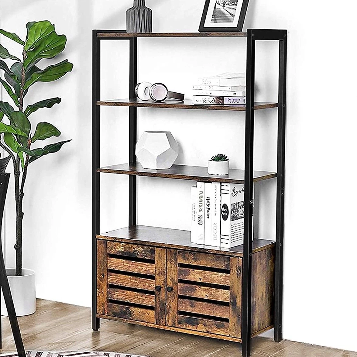 Dit industriële rek biedt ruimte voor fotolijsten, trofeeën, decoratie en veel meer! Een stijlvolle opbergoplossing in je woonkamer, kantoor enz. Het rek beschikt ook over een kastje met 2 charmante deurtjes, waarachter je enkele spullen kwijt kunt. Gemaakt van rustiek bruin spaanplaat en zwart metaal. Belastbaar gewicht per legplank: 20 kg