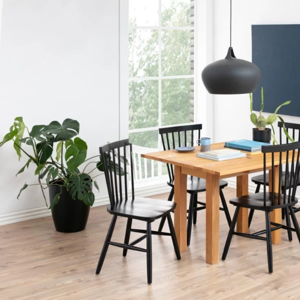 De eetkamerstoel Riano: Slank PU gelakt berken onderstel voegt elegantie en duurzaamheid toe.