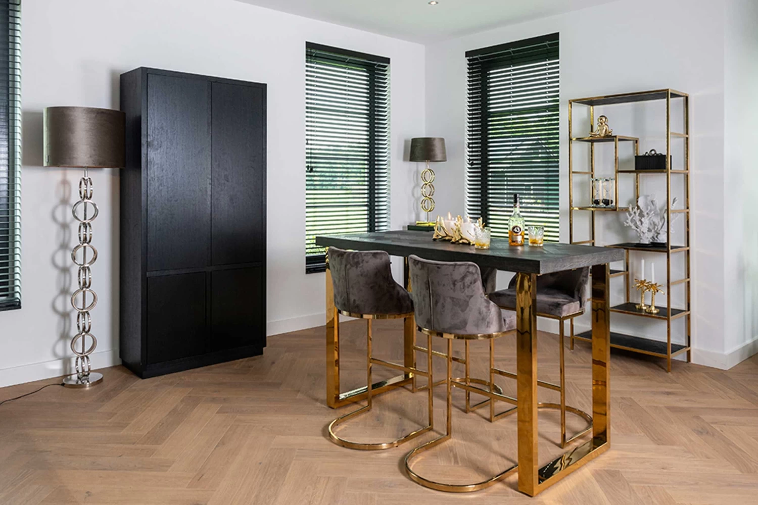 Bartafel Bony maakt onderdeel uit van de uitgebreide collectie zwart eikenhout met metalen frame in geborsteld goudkleur. Die combinatie zorgt voor een erg klassevolle look in je interieur. Deze zwarte bartafel is een statement in je woning en bovendien uiterst multifunctioneel. Je kan hem bijvoorbeeld inzetten voor een dagelijks ontbijt of juist een borrel met vrienden. De elegante, maar stoere bartafel is ook verkrijgbaar in een uitvoering van eikenhout en zilvergrijs. Ontdek de verschillende andere woonkamermeubelen uit deze collectie bij Emob!  Tip: combineer met onze prachtige barkrukken.Â