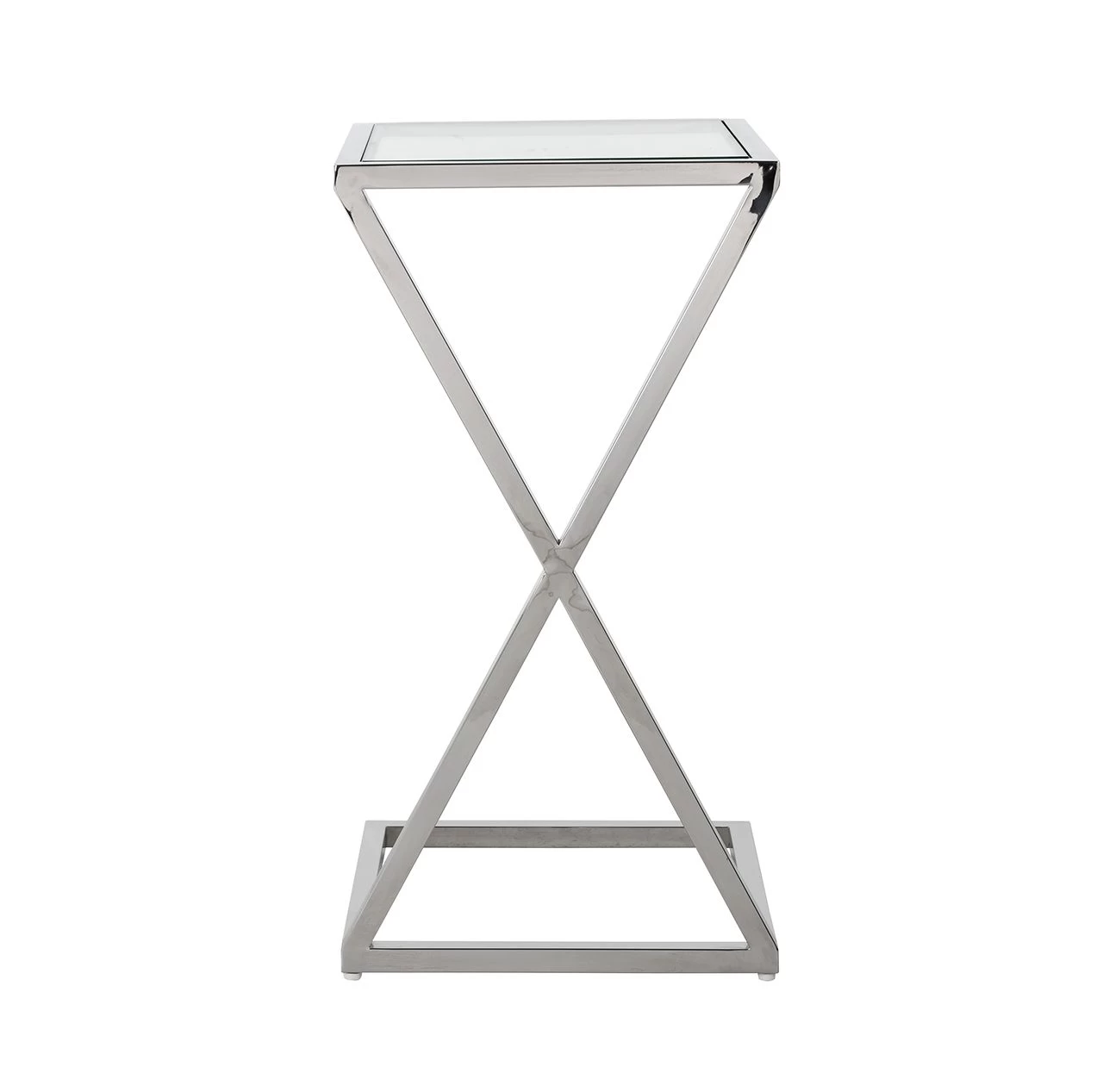 Bijzettafeltje Paramount met kruispoot, gemaakt uit zilverkleurig roestvrij staal en een tafelblad in glas.