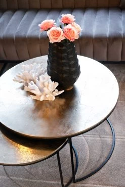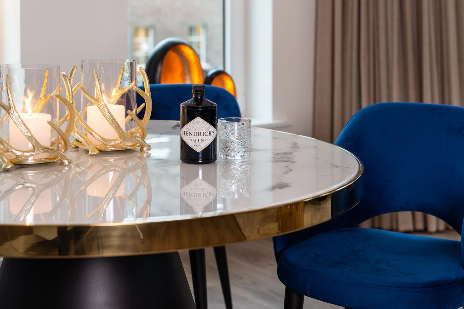 Deze eettafel Odis steekt er met kop en schouders bovenuit door de fantastische mix van kleuren en kwaliteitsvolle materialen. Het kegelvormige frame in roestvrij staal zorgt voor een solide basis. Daarop ligt een prachtig tafelblad in wit imitatiemarmer dat werd afgewerkt met gouden randen. Aan dit designmeubel kunnen gemakkelijk 4 personen, misschien zelfs 6 personen tafelen. In dezelfde reeks zijn ook een bijzet- en salontafeltje beschikbaar.
