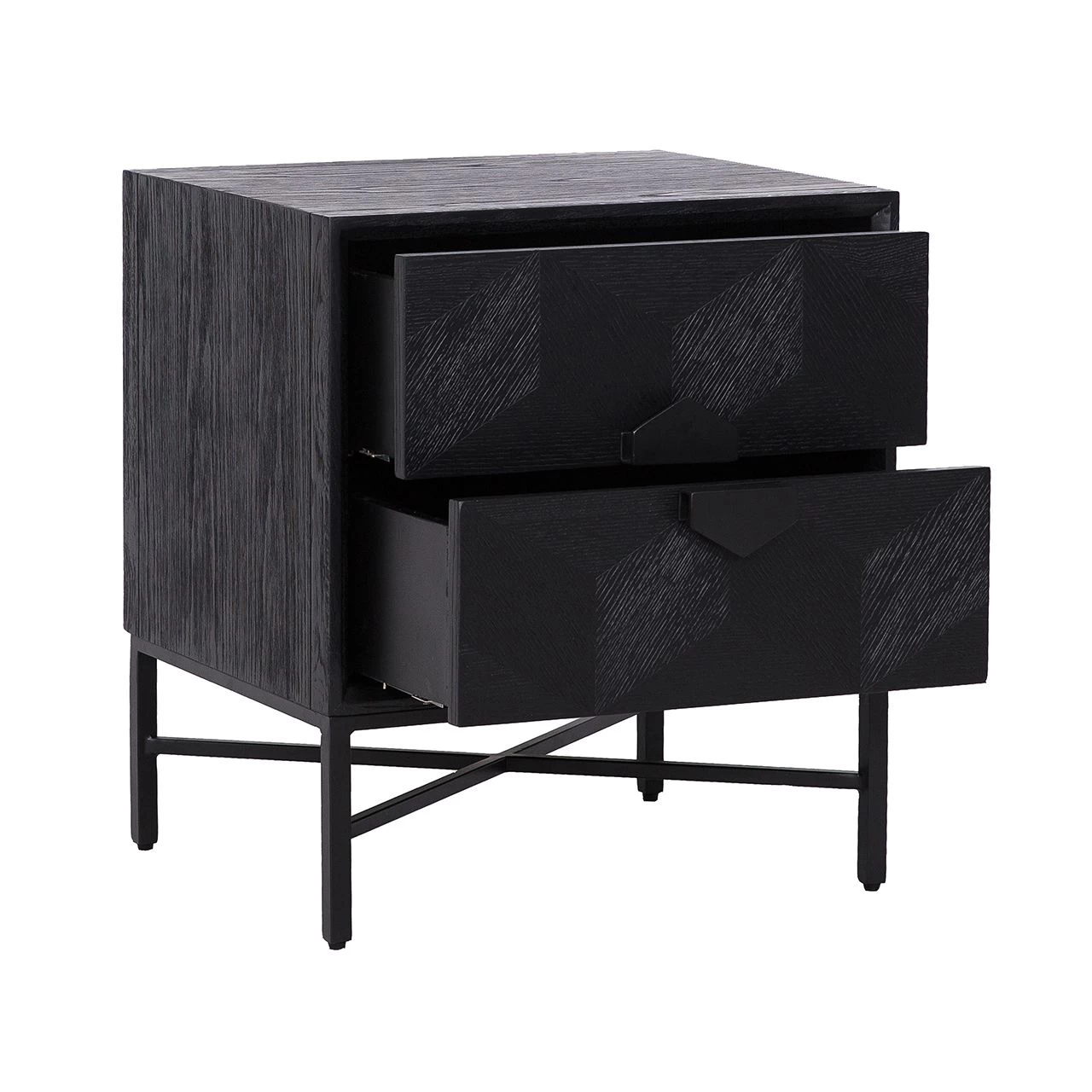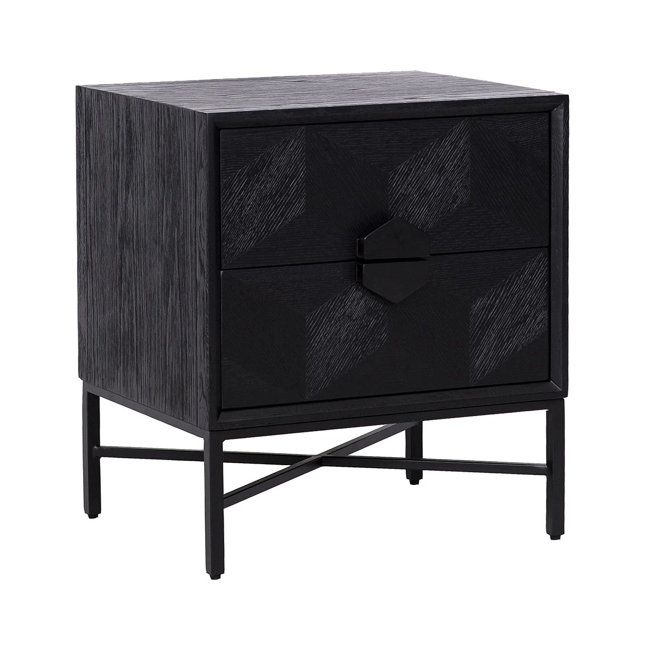 Zo valt dit kleine ladekastje op door haar afwerking in eikfineer en haar metalen poten met minimalistisch design, maar vooral ook door haar lades met hun kenmerkende geometrische kubuspatroon.