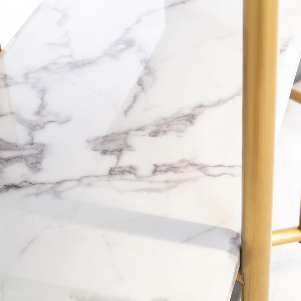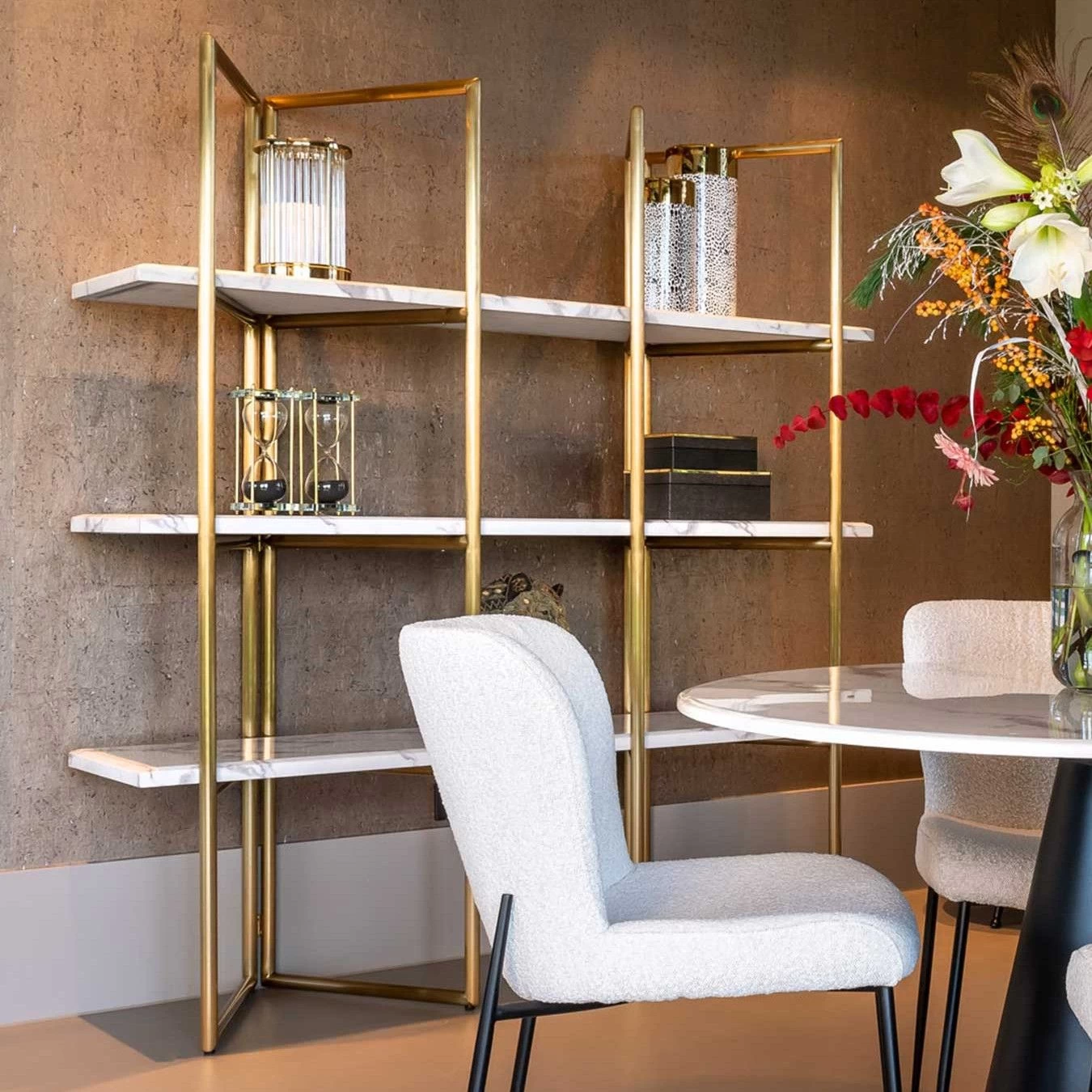 Open wandrek Lagrange met 3 legplanken, samengesteld uit een kader in goudkleurig roestvrij staal en planken in wit marmer.Â