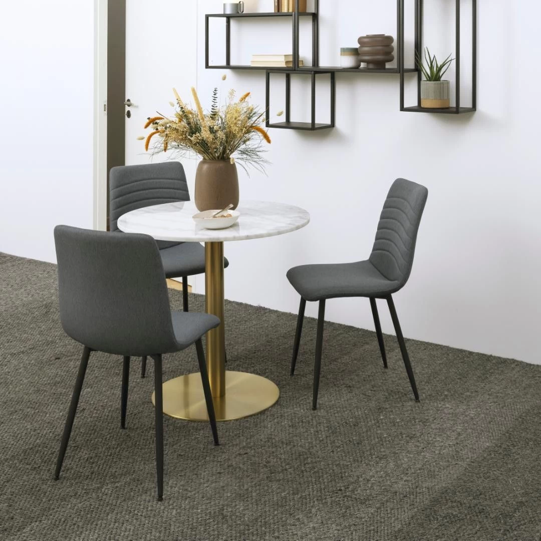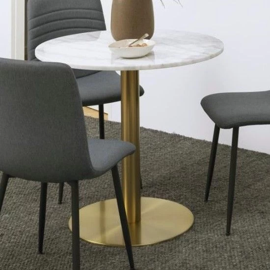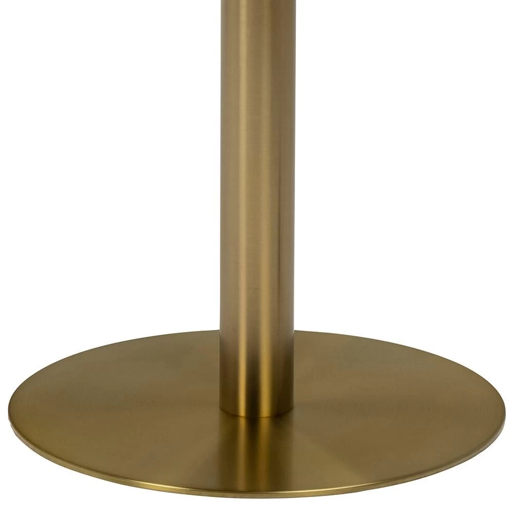 Een royale ruimte om te dineren wordt je aangeboden door deze eettafel met gepolijst wit marmeren tafelblad. Ondersteund door een rond geborsteld messingkleurig metalen onderstel past de eettafel in elk modern interieur. Je kan er gemakkelijk met z’n vieren aan dineren. Combineer met een set van eetkamerstoelen en vind de perfecte, moderne look die bij jouw inrichting past!