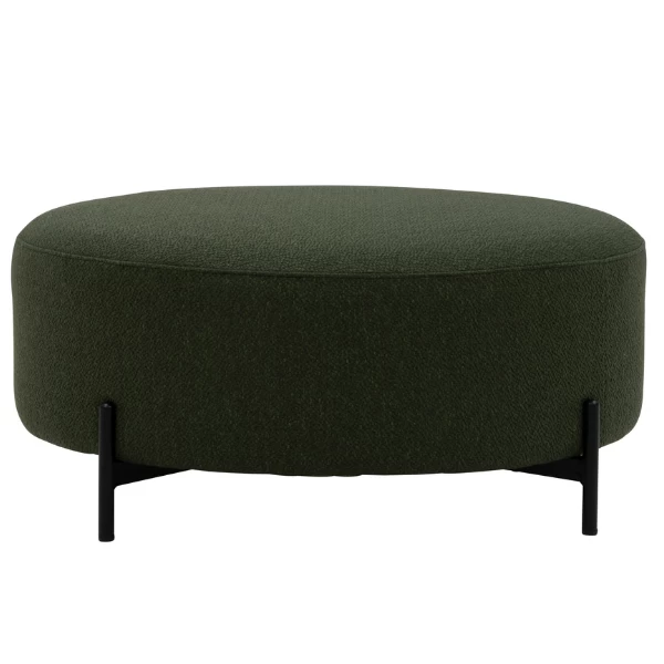 Ronde poef Larry, ø80 cm. Met een metalen onderstel en een mosgroene stofbekleding.Â