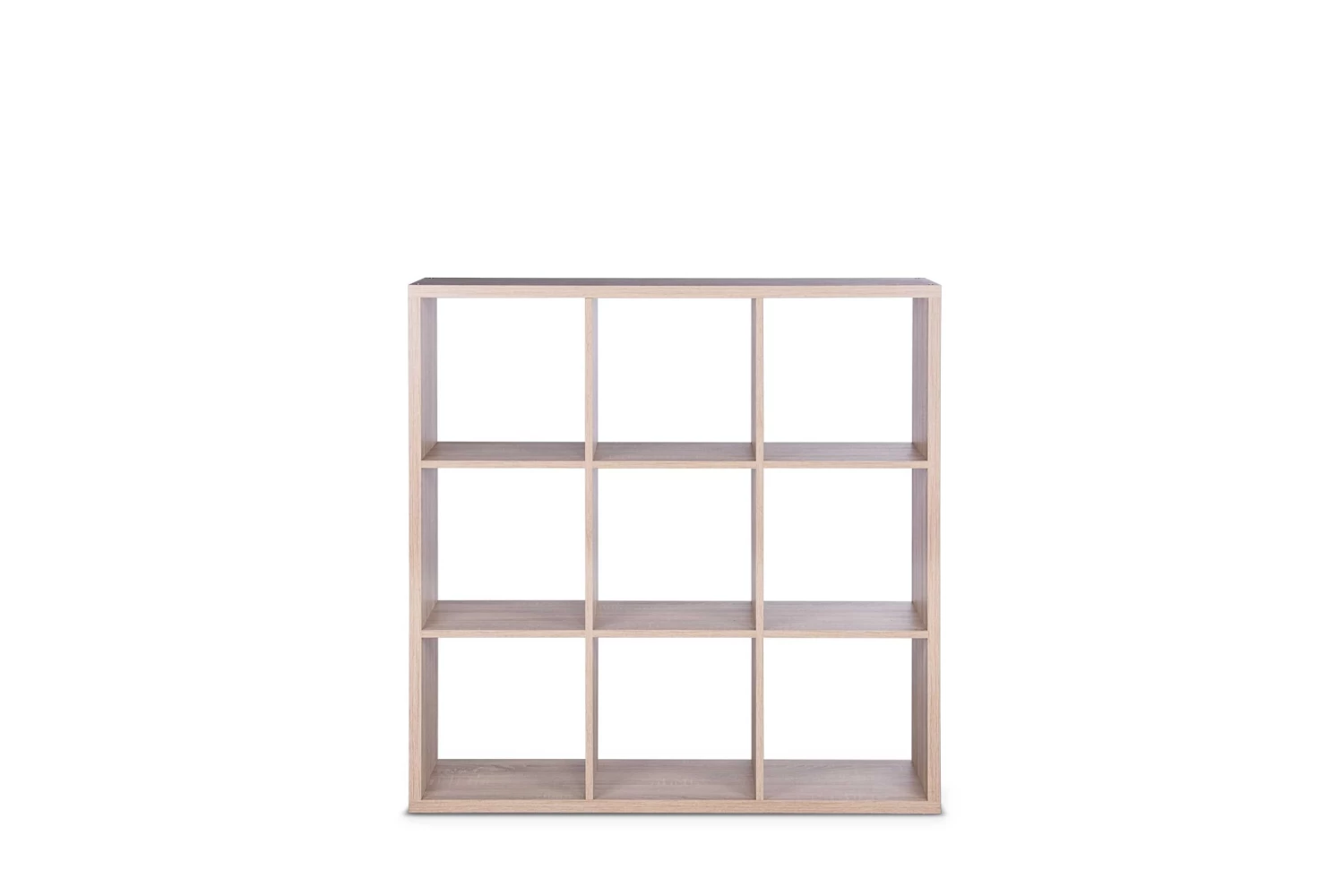Roomdivider Max is gemaakt van spaanplaat van 25 mm dik en is afgewerkt in eikdecor. De kast telt 9 vakken. Ook leuk met enkele (kleurrijke) mandjes om ook kleinere spullen op te bergen.