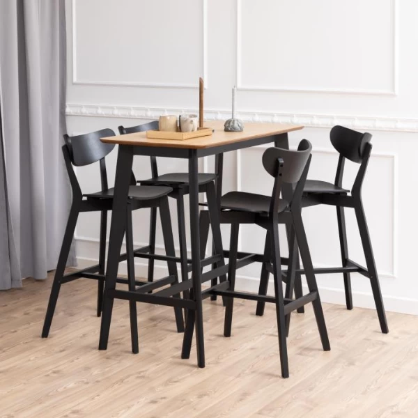 Het onderstel van de barkruk is gemaakt van matzwart ac-gelakt rubberhout, dat niet alleen het algehele ontwerp aanvult, maar ook stabiliteit en stevigheid toevoegt. Hierdoor kan hij een gewicht dragen dat geschikt is voor dagelijks gebruik en zorgt hij voor een veilige en comfortabele zitervaring.