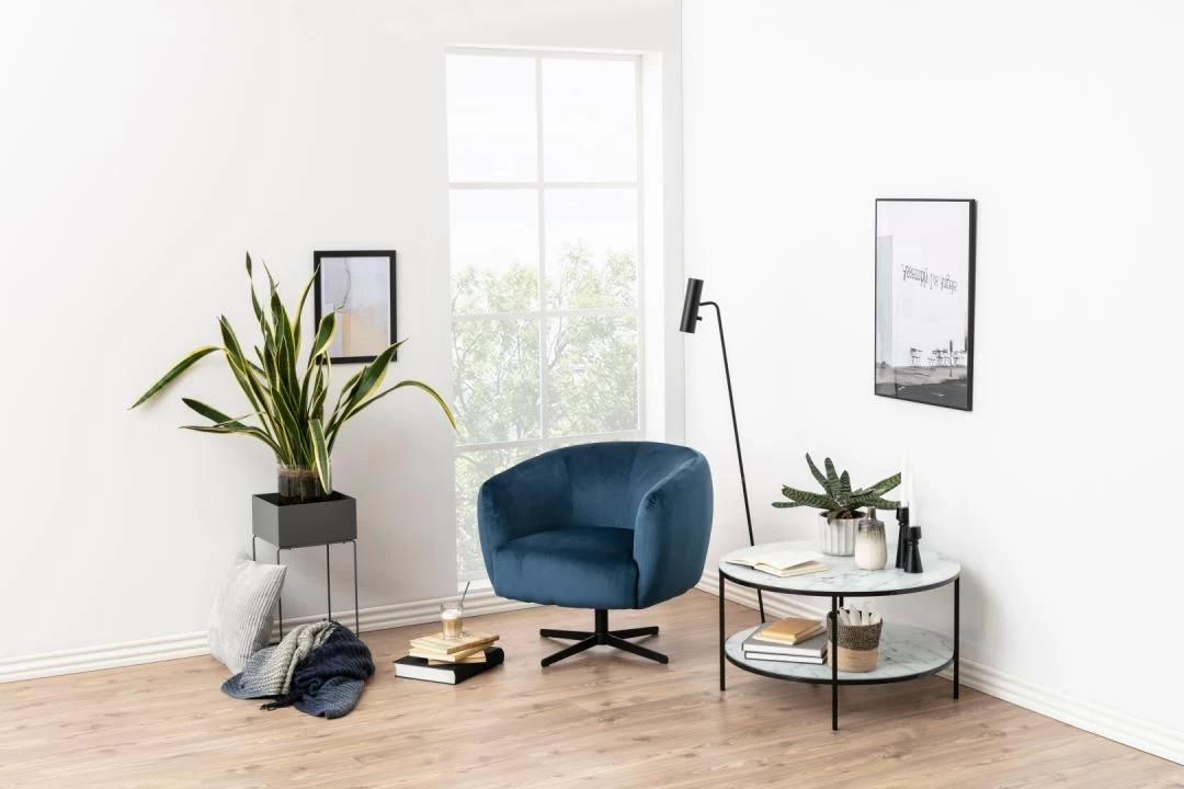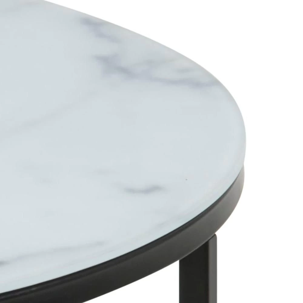 De Alisma-salontafel is zeer praktisch dankzij haar extra legplankje. Je kan gemakkelijk een lampje, kaars of plant op het tafelblad plaatsen en boeken of magazines op het legplankje leggen. Deze salontafel is gemaakt uit kunstmarmer in het wit met zwarte poten.