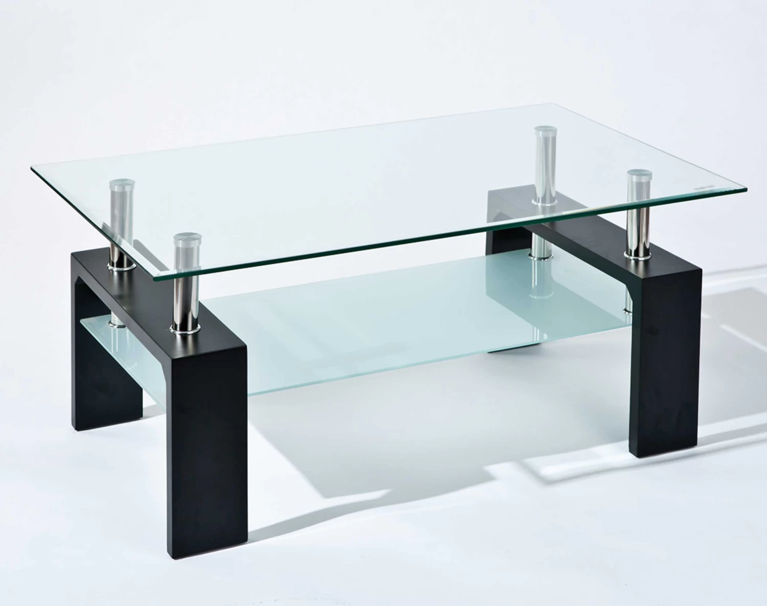 Salontafel Alva heeft een zwart onderstel van MDF. Wat deze tafel zo speciaal maakt, zijn het glazen tafelblad en de glazen legplank, beide gemaakt van veiligheidsglas van 8 mm dik.