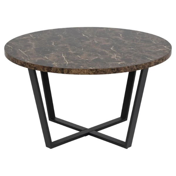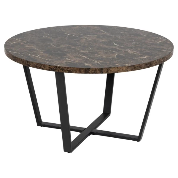 Salontafel Amble heeft een diameter van 77 cm. Het tafelblad is gemaakt uit melamine en heeft een marmerlook. De metalen poten zijn zwart gepoedercoat.