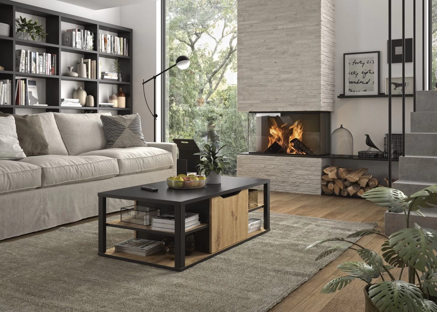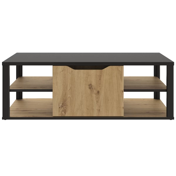 De salontafel is gemaakt uit spaanplaat in het zwart en afgewerkt met details uit eik decor.