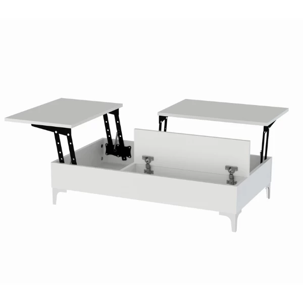 Salontafel Gabrielle is niet alleen stijlvol maar ook nog eens multifunctioneel. Zo kan een deel van het tafelblad omgevormd worden tot 2 uitklapbare bureautafels zodat u gemakkelijk op uw laptop kunt werken vanuit uw comfortabele zetel. Onder deze uitklapbare tafels is er ook nog eens opbergruimte voorzien om uw laptop of ander bureaumateriaal achteraf gemakkelijk weg te bergen. De salontafel heeft daarnaast nog een opklapdeur met daaronder nog meer bergruimte.