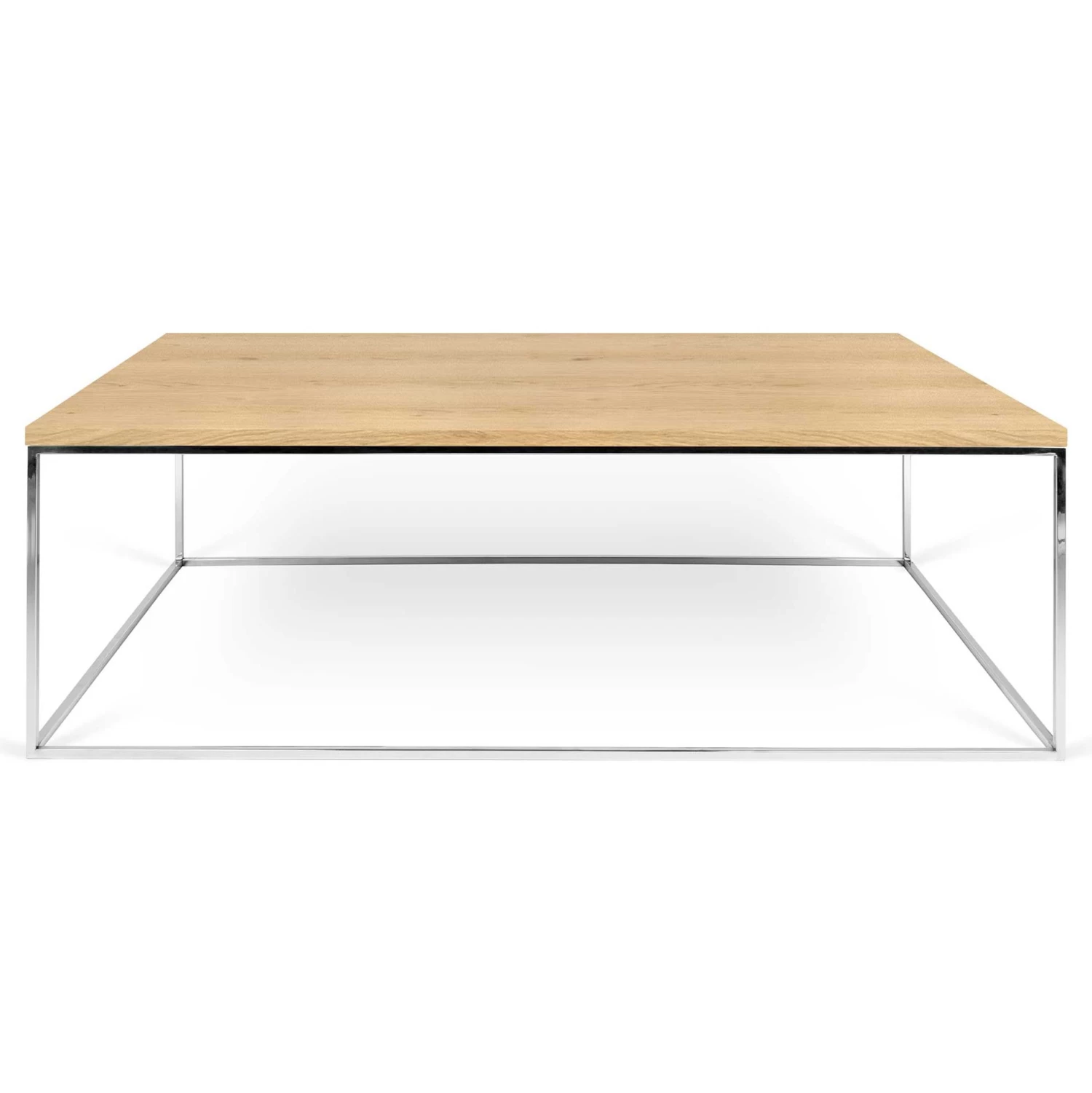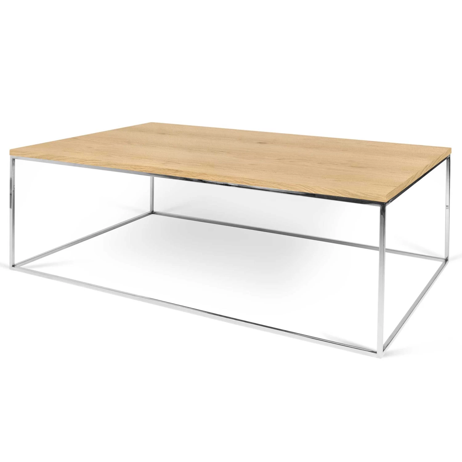Rechthoekige salontafel Gleam met tafelblad in eikfineer en onderstel in verchroomd staal.