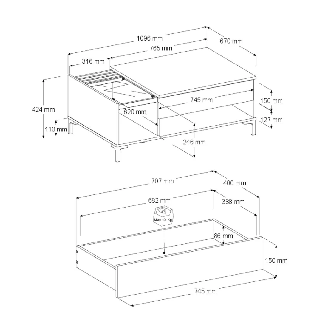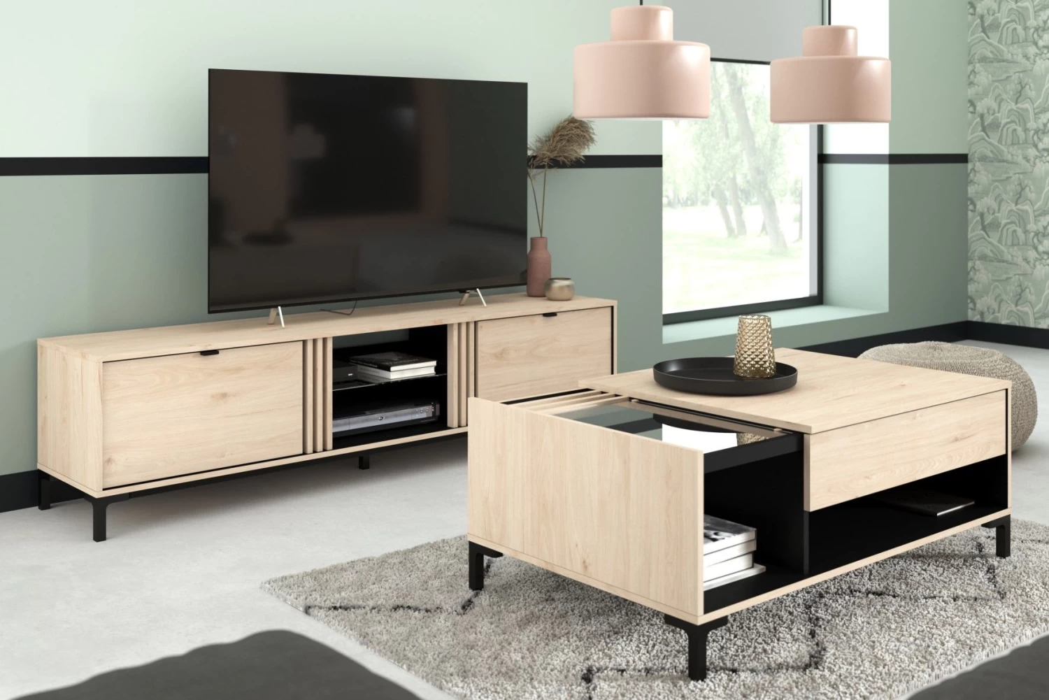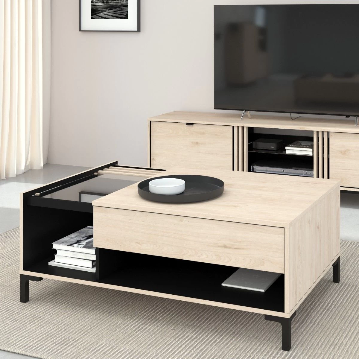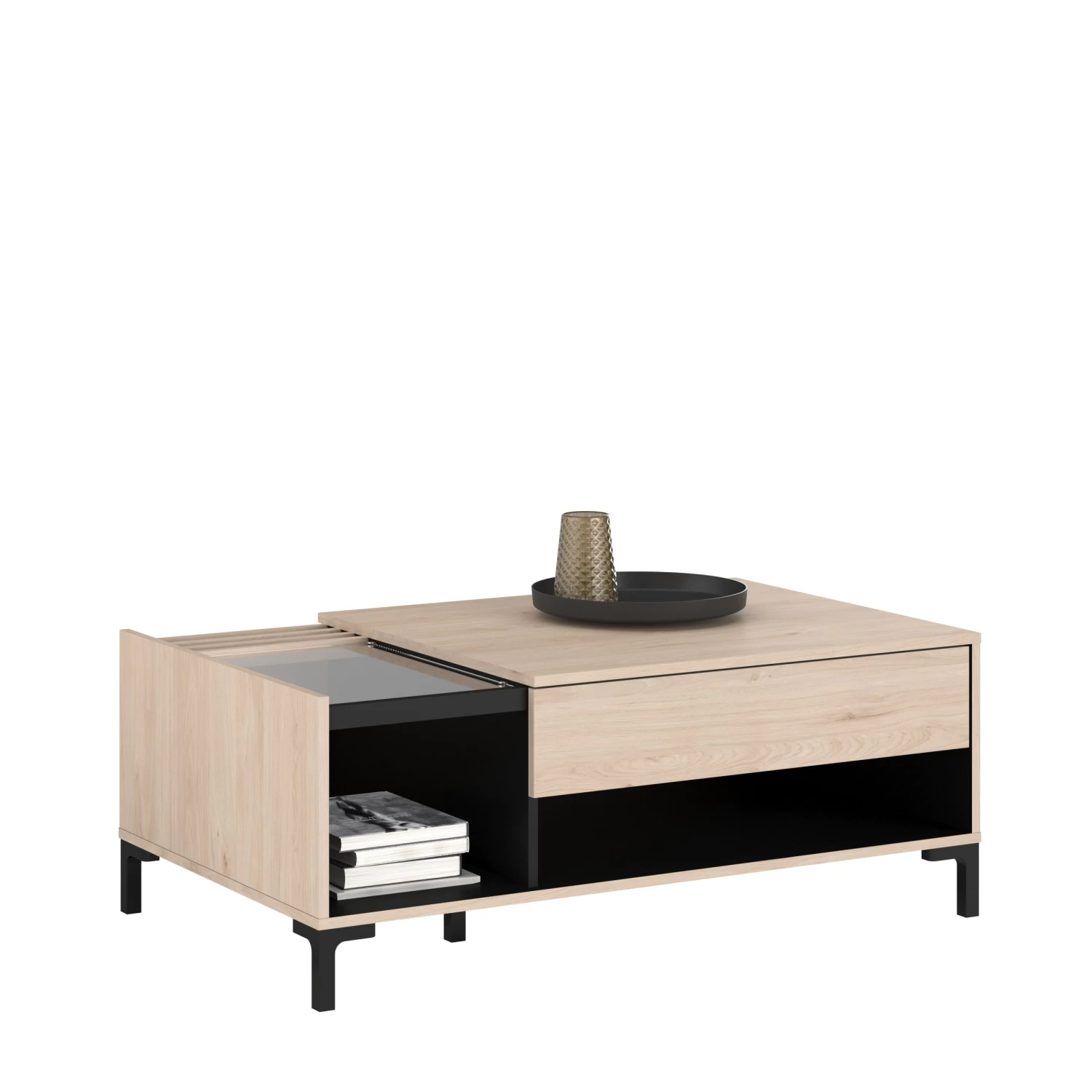 Salontafel Iseka met 1 lade, gemaakt uit spaanplaat in een licht decor van Jackson eik en zwarte accenten.Â
