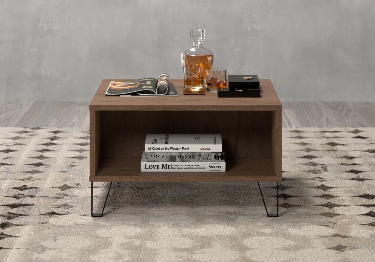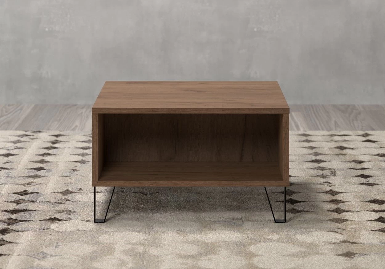 Salontafel en tegelijk bijzettafel met 2 vakken. Afmetingen: 60 x 60 cm. Ruimtebesparende oplossing voor kleine kamers. Vervaardigd uit duurzaam melamine-oppervlak met opvallend ontwerp. Eenvoudige montage in 40 minuten. 6 maanden garantie. FSC-gecertificeerd. Goed te combineren met andere meubels uit de serie.