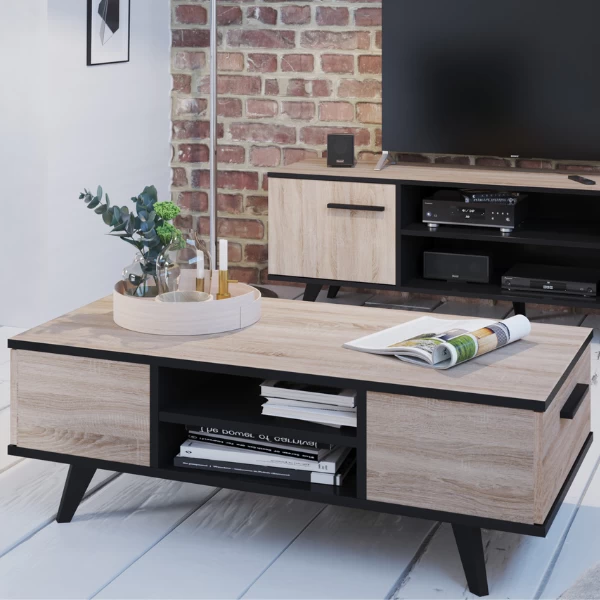 Salontafel Wilke 2 Lades En 2 Open Vakken-geborstelde Eik/matzwart