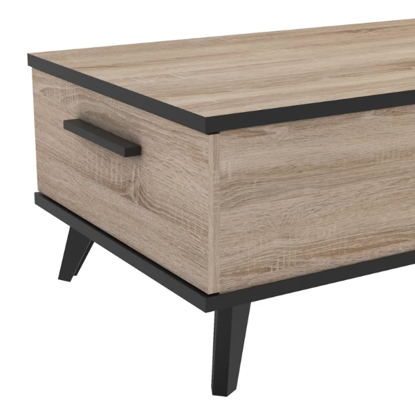 Salontafel Wilke is gemaakt uit gemelamineerde spaanplaat in geborstelde eikdecor en matzwart. De salontafel bestaat uit 2 lades en 2 open vakken.