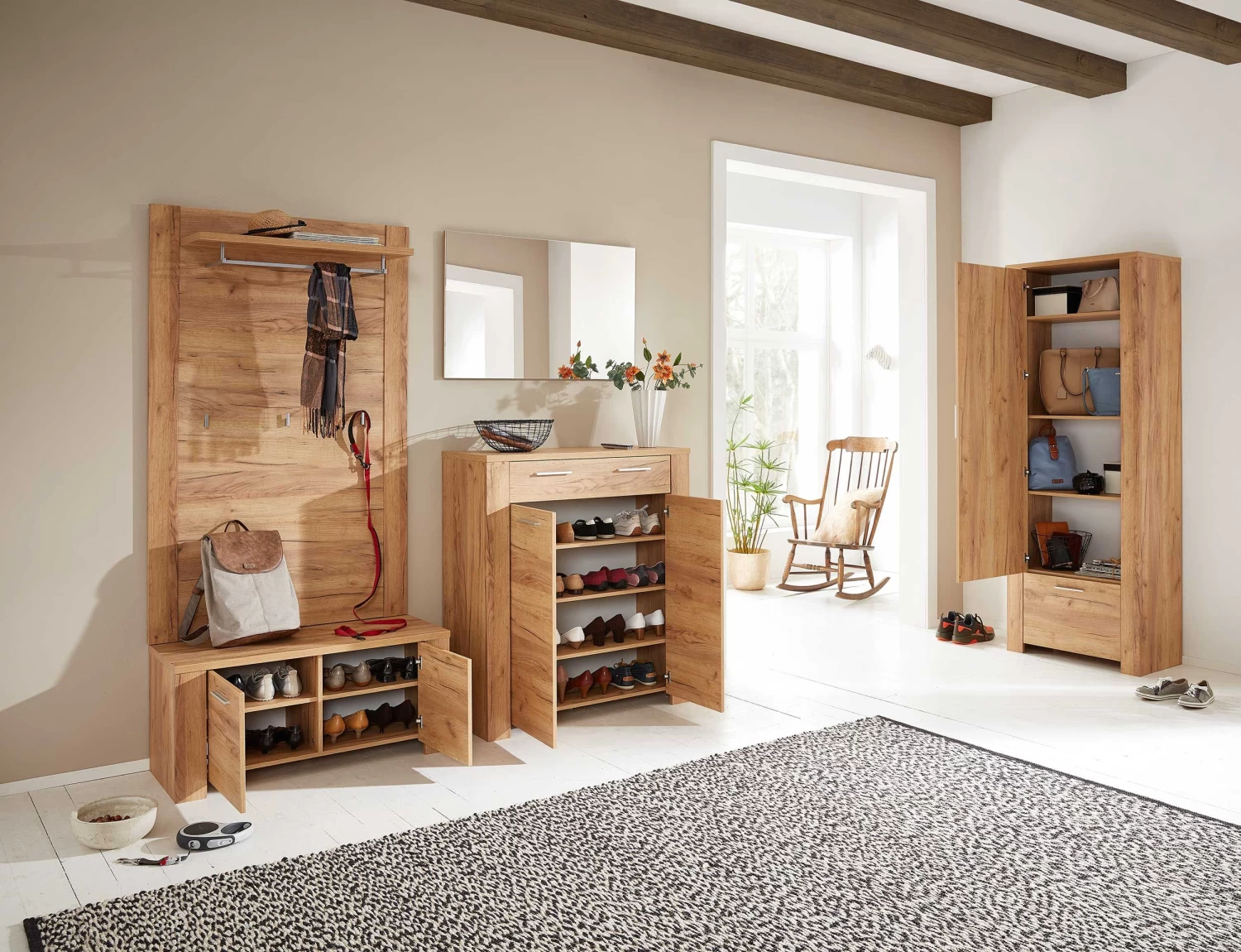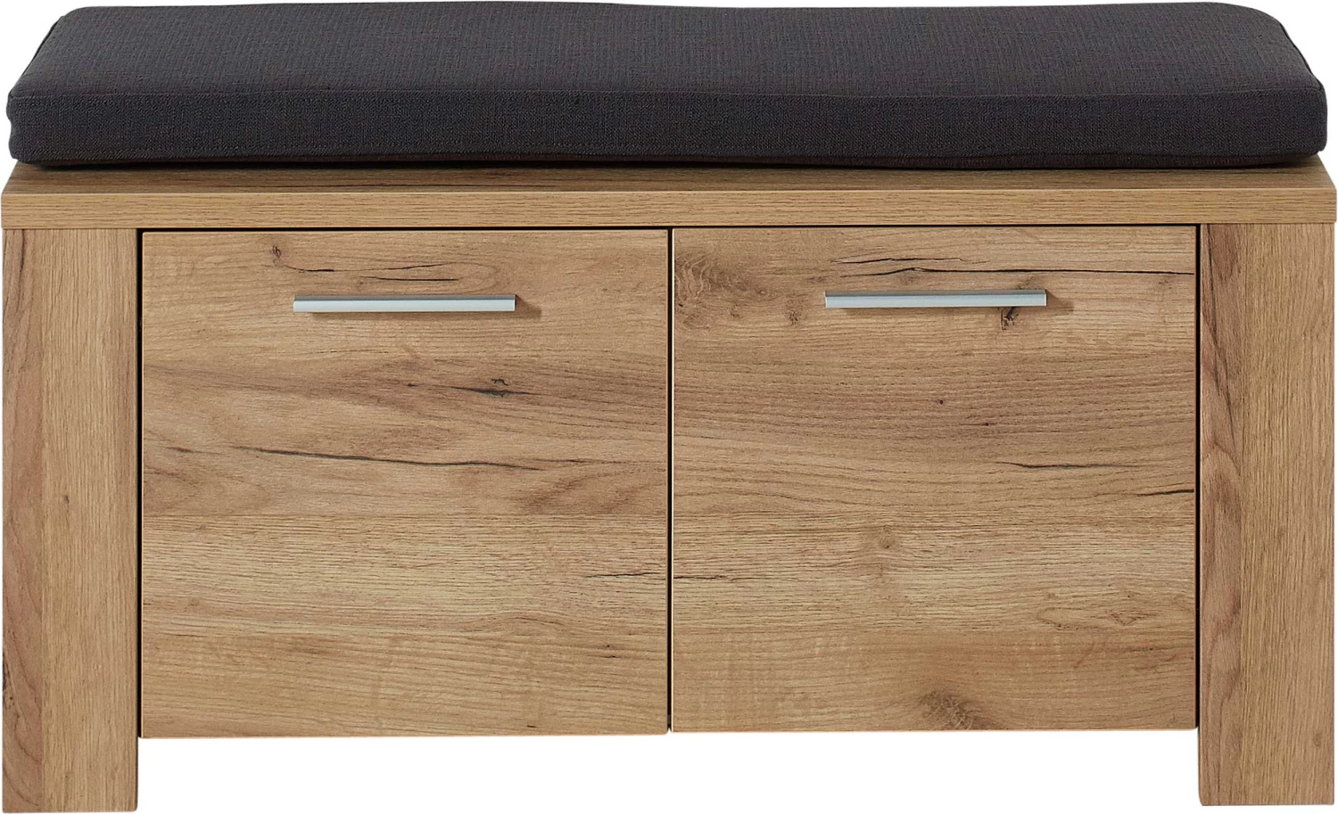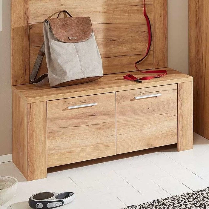 De Castor-reeks in Navarra eikdecor is een duurzaam en tegelijk aangenaam ogende collectie voor je inkomhal. Dit karaktervolle meubel kan zowel alleen als in combinatie met andere meubelen van deze reeks een uitstekende toevoeging zijn aan je interieur. Achter de dubbele deur van de schoenenkast bevinden zich twee verstelbare legplanken die plaats bieden aan om en bij de 8 paar schoenen. De metalen handgrepen, de hoogwaardige ABS-randen en de coating in melaminehars maken het meubel af! Je kan bij Emob bovendien een bijpassend zitkussen aanschaffen in antracietkleur, zodat je op een comfortabele zitbank je schoenen kan aantrekken.Â