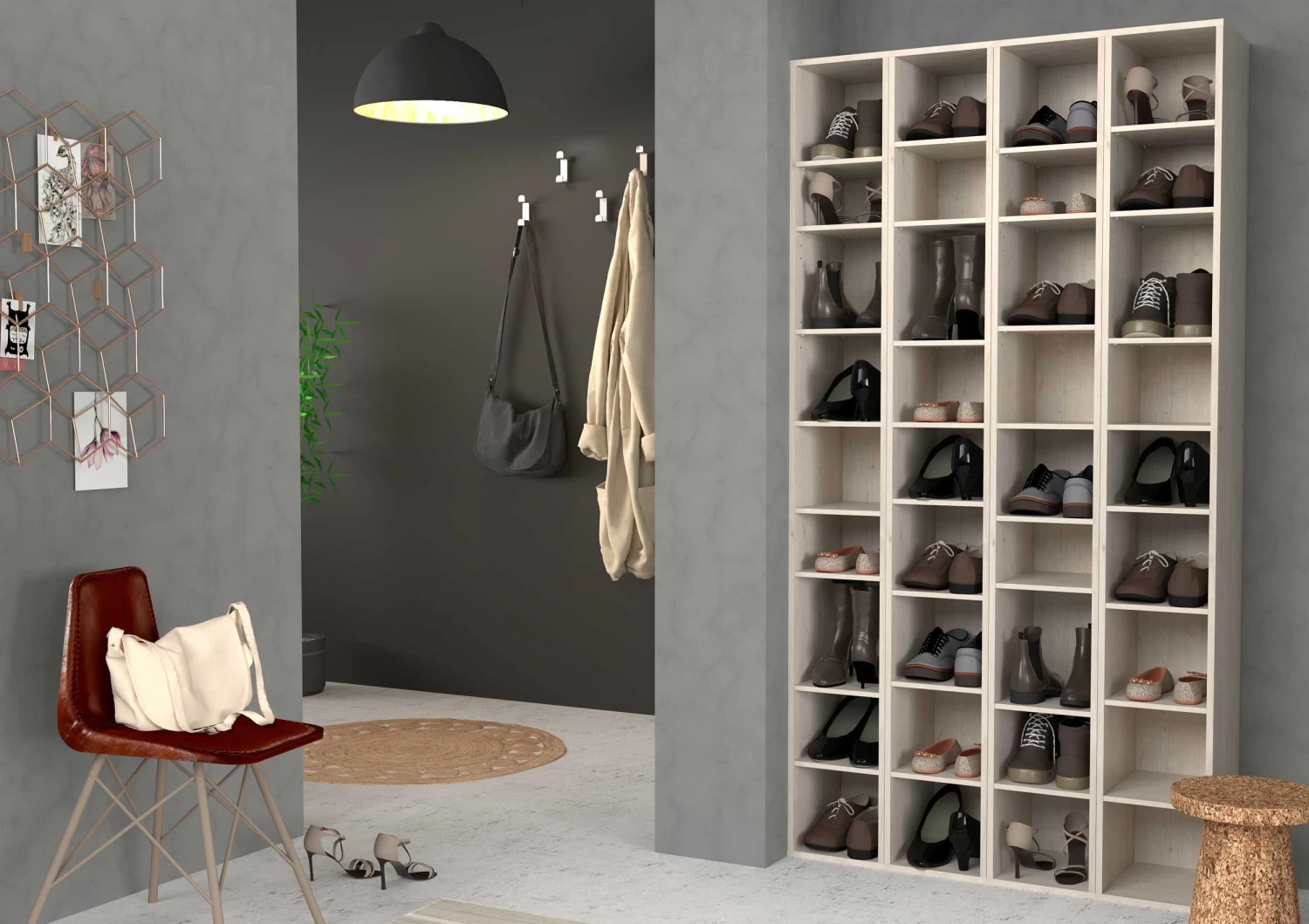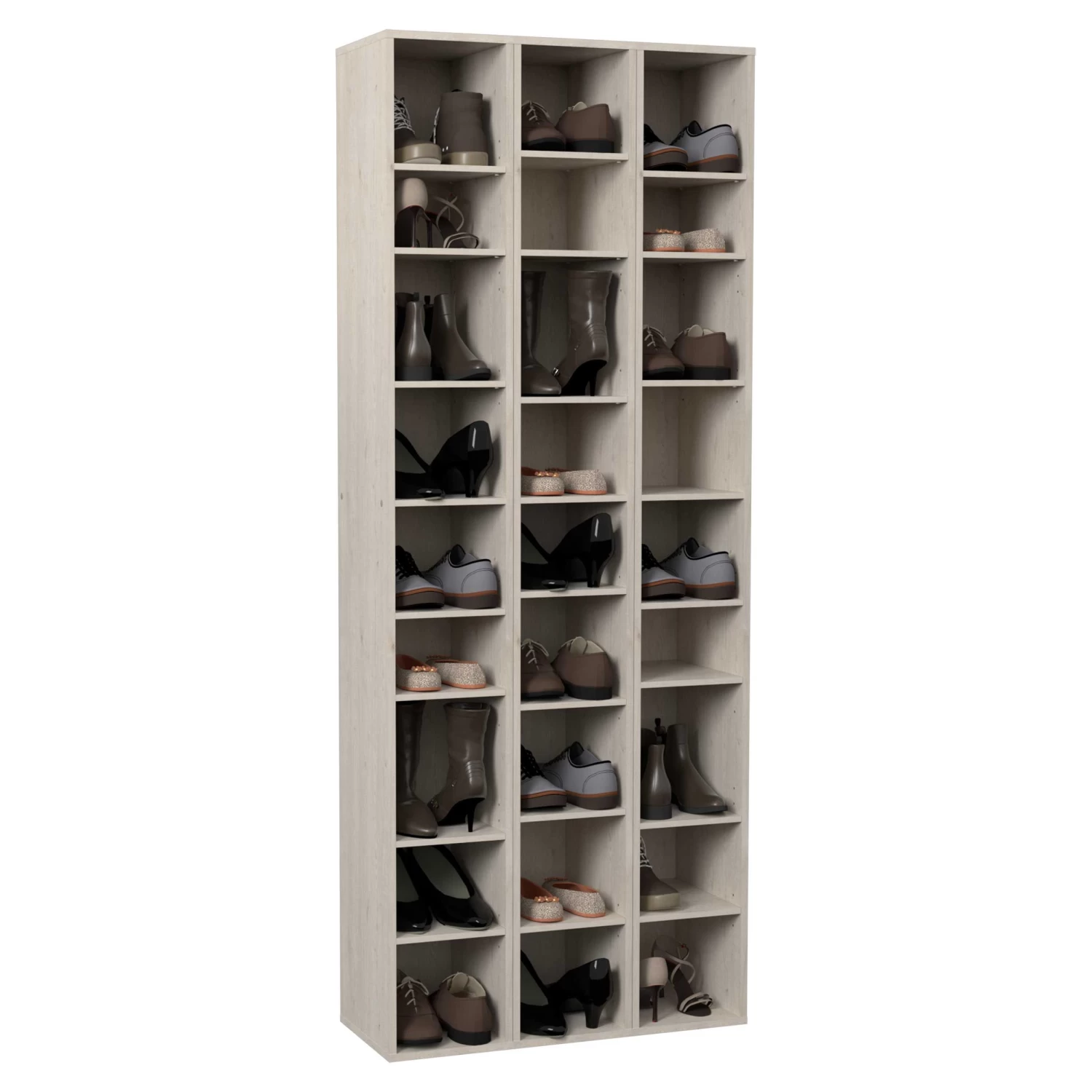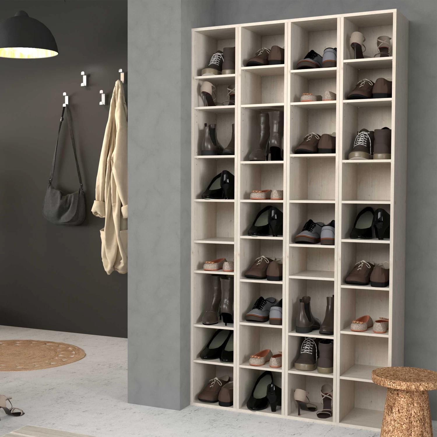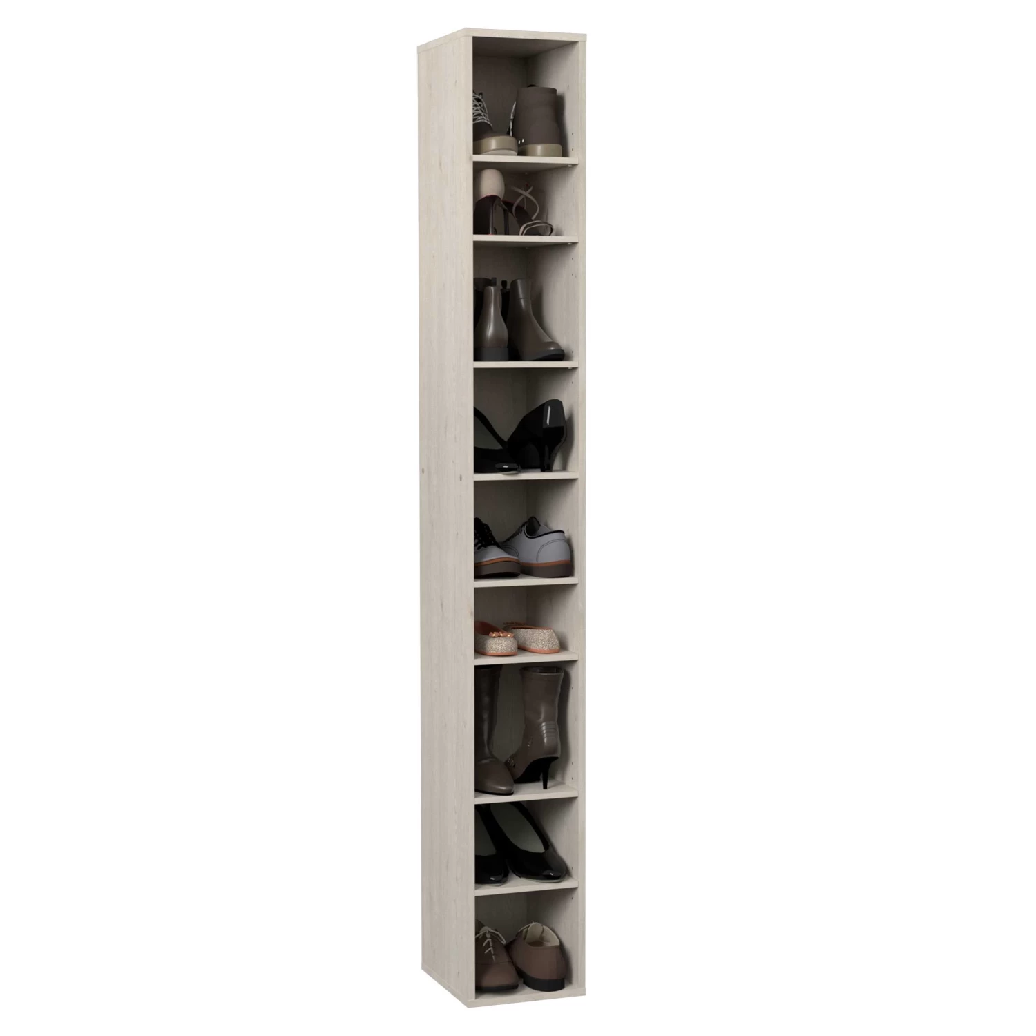 Met deze schoenkastmodule stel je zelf jouw schoenkast samen op maat van jouw schoenencollectie. Combineer verschillende modellen tot de schoenkast met de ideale grootte. 1 module is 200 cm hoog, 26 cm breed en 32 cm diep en beschikt over 8 legplankjes. Elk legplankje is geschikt voor 1 paar schoenen. De hoogte tussen de legplankjes kan je zelf kiezen. Zo kan je zowel jouw sneakers, pumps als laarzen in schoenkast Stan opbergen.