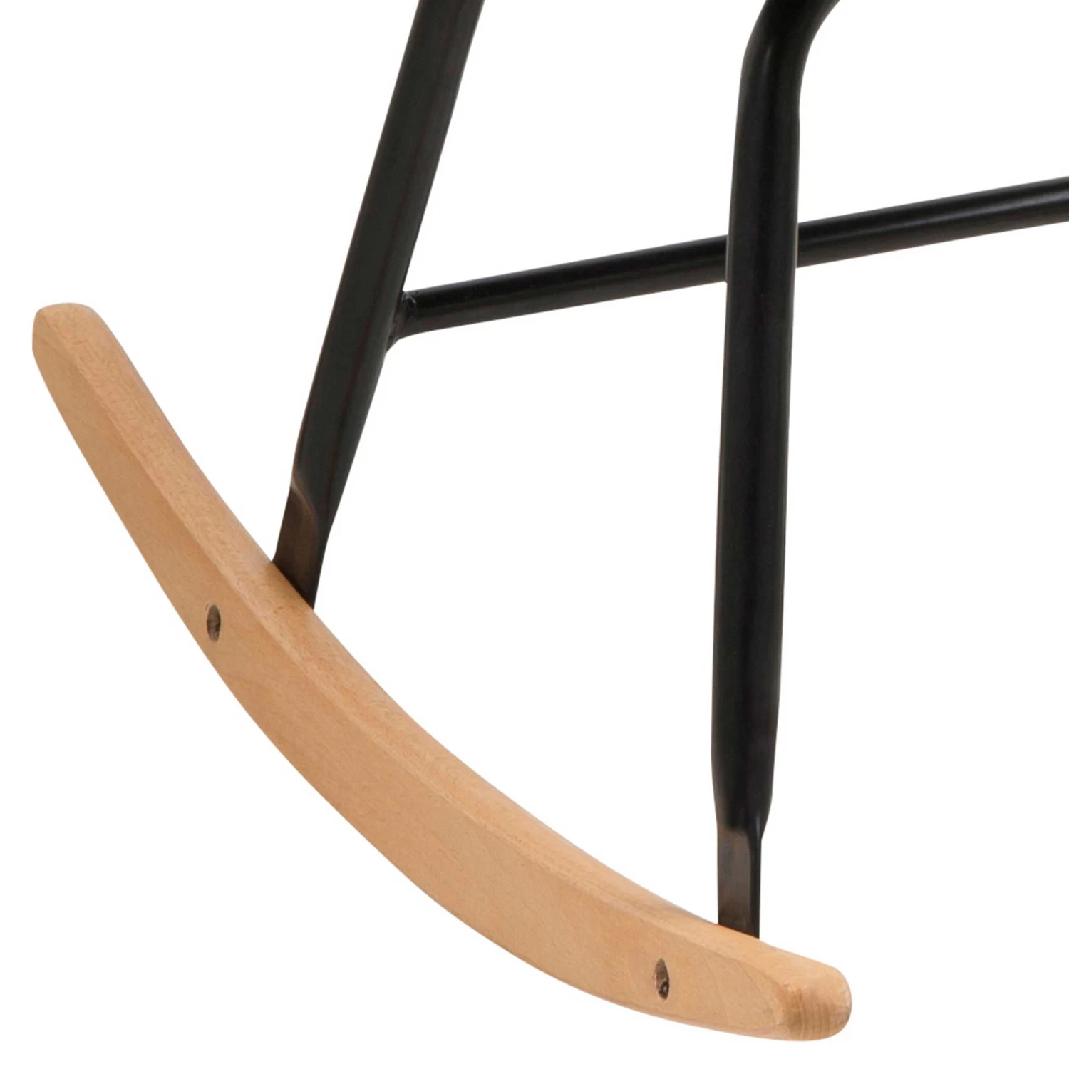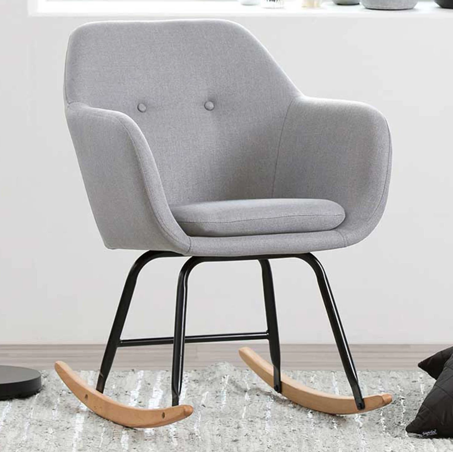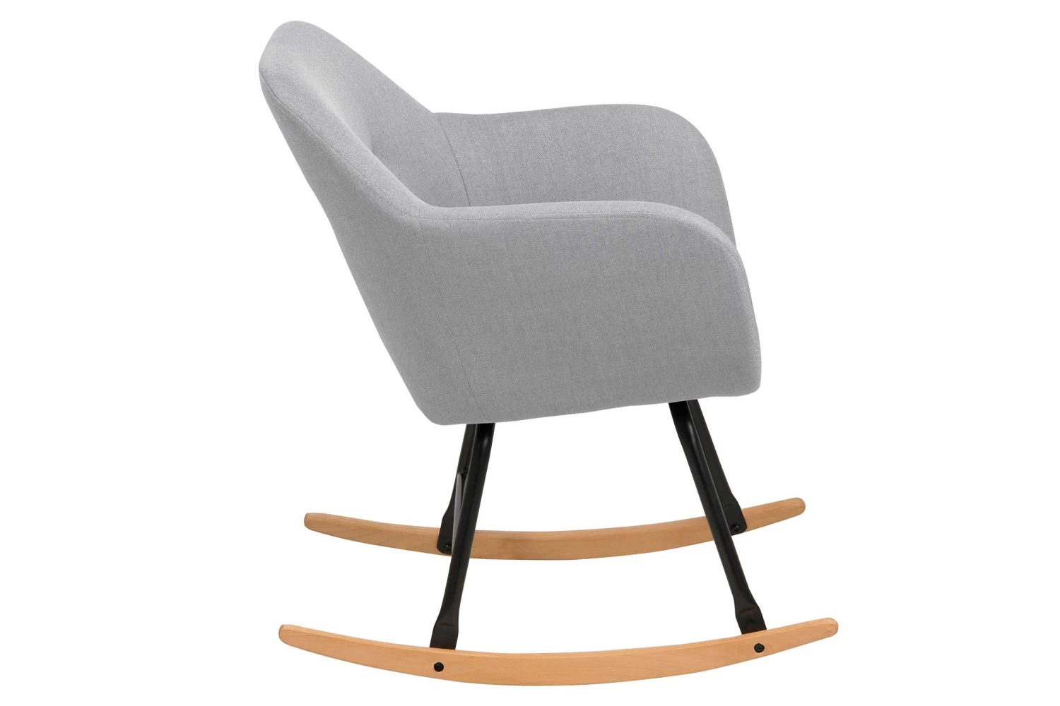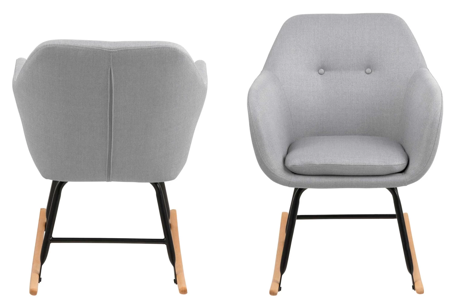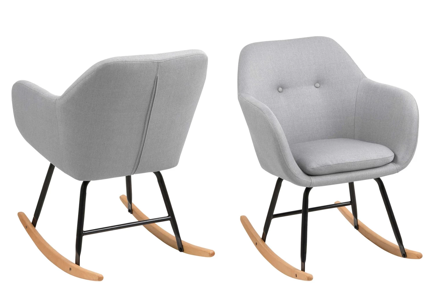 De Hermeline schommelstoel met armleuningen is bekleed met een lichtgrijze stof en beschikt over een comfortabel zitkussen. De poten bestaan uit zwart metaal en massief beukenhout met een eikdecor. Deze prachtige stoel is perfect om een ontspannend boek in te lezen of in weg te dommelen!Â