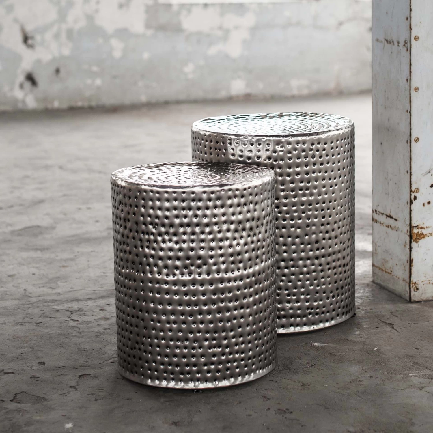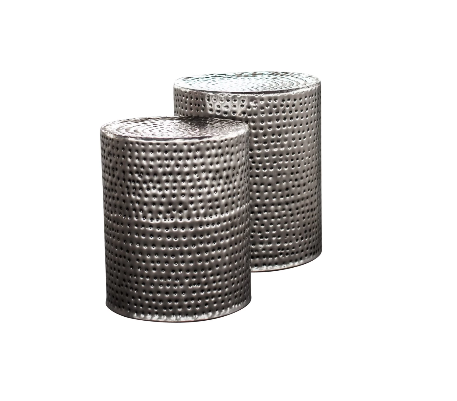 Deze 2 bijzettafeltjes zijn uitgevoerd in gehamerd staal. De tafeltjes zijn over de hele oppervlakte versierd met een mooi gaatjespatroon. Ook verkrijgbaar in het zwart.