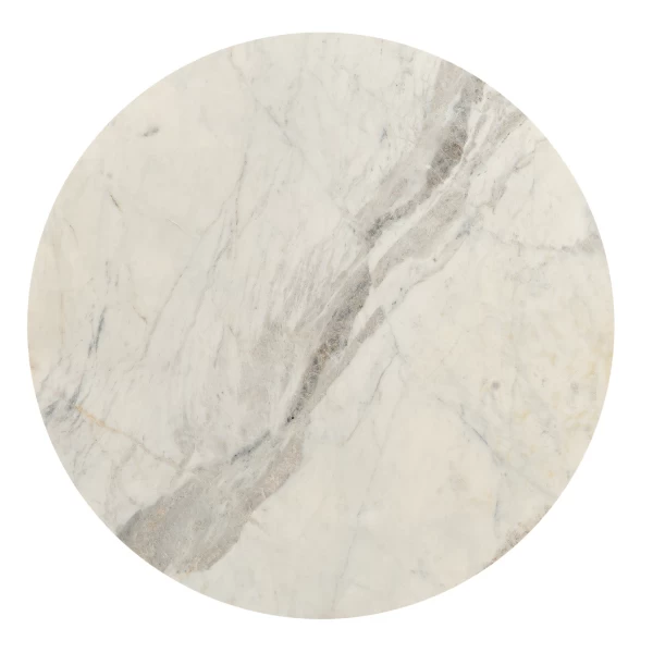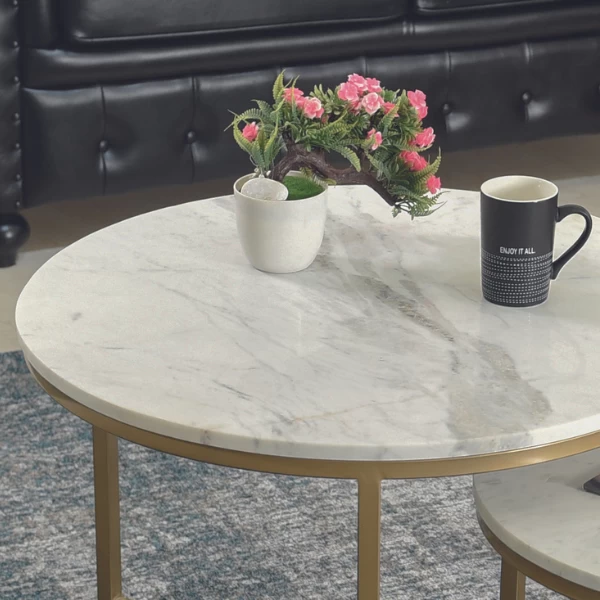 Set van 2 salontafels Naneva heeft een frame uit goudkleurig metaal en een wit marmeren blad. De grote tafel heeft een diameter van 70 cm en de kleine een diameter van 50 cm.
