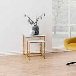 De Anika set van twee bijzettafels is ideaal om in je woonkamer tegen de muur of naar de zetel te plaatsen. Deze bijzettafels zijn zeer praktisch en compact. Je kan gemakkelijk een lampje, kaars of plant op het tafelblad plaatsen. Deze bijzettafels zijn gemaakt uit kunstmarmer in het wit met gouden poten.