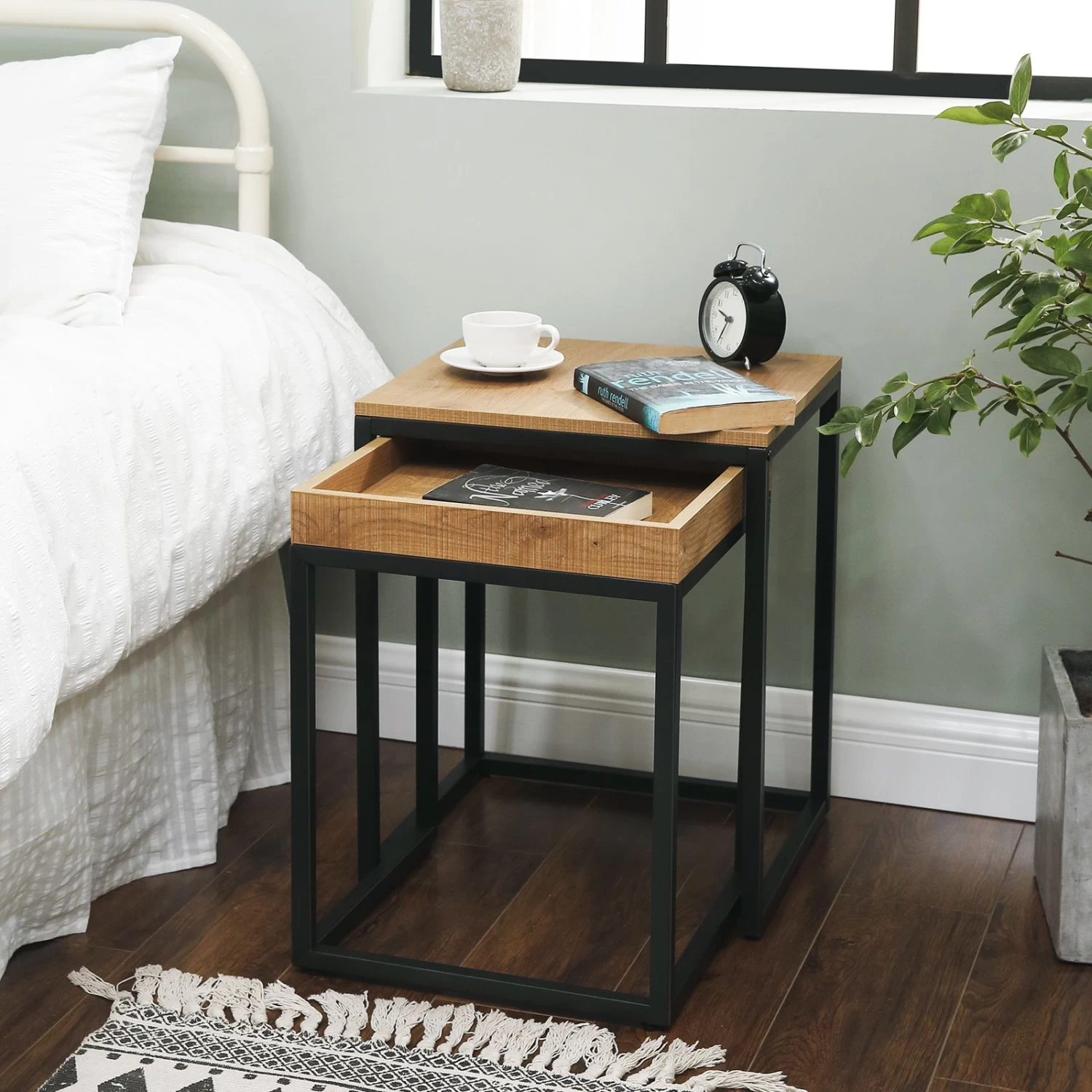Deze bijzettafelset bestaat uit 2 tafeltjes met een blad uit honingbruin spaanplaat en een robuust metalen frame. Gebruik de bijzettafeltjes samen als salontafel of plaats er eentje naast je fauteuil om een notitieboek op te leggen. Het kleine tafeltje heeft verhoogde randen, waardoor je hier makkelijk pennen kunt bewaren.