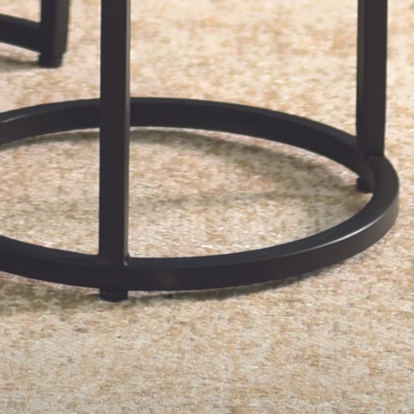 Drie salontafeltjes Amana hebben een metalen onderstel en een blad uit zwart magnoliahout.