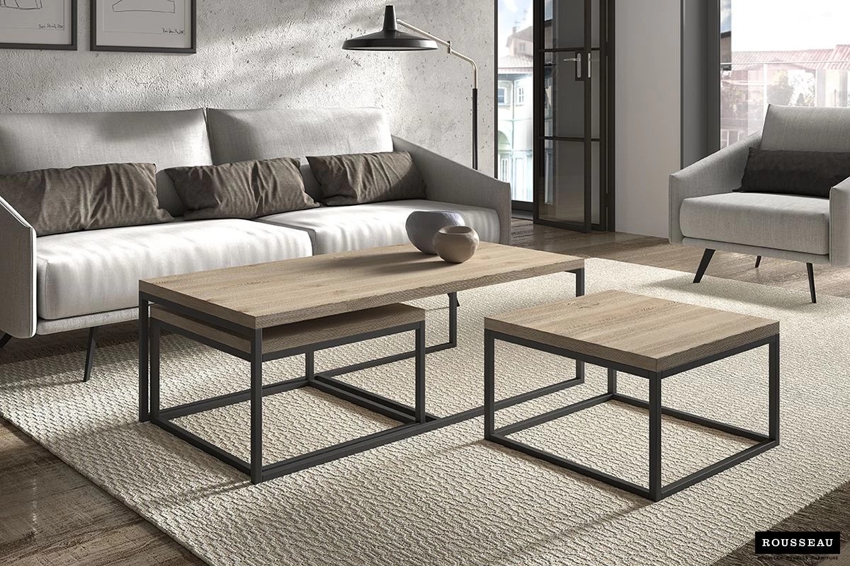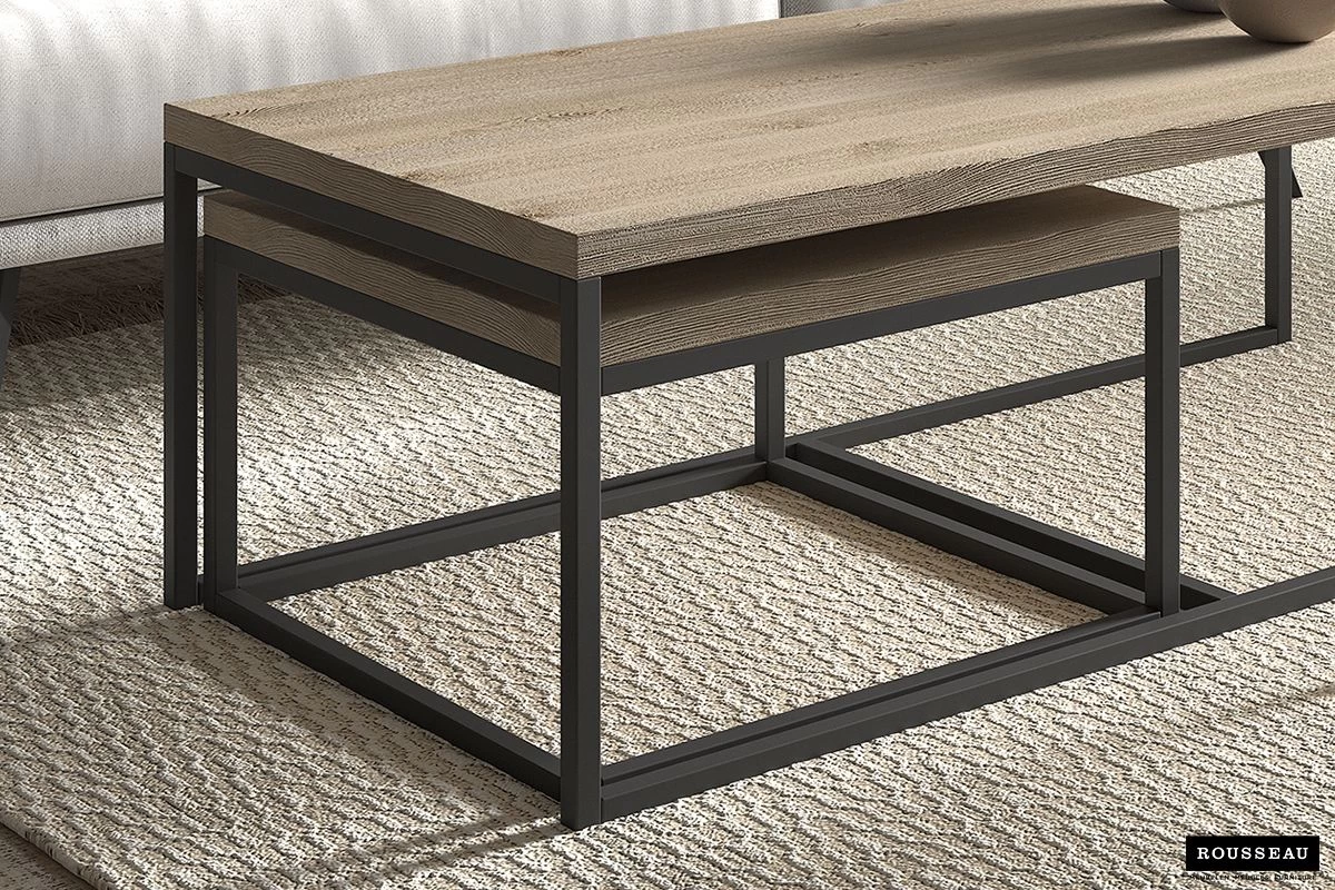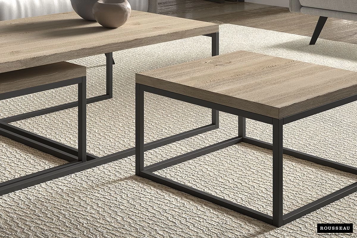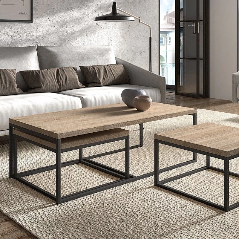 Combineer functionaliteit en design met de 3-delige bijzettafelset Jenna. De bijzettafeltjes hebben een houten blad en een zwart onderstel, wat hen een industriële uitstraling geeft. Het blad is vervaardigd uit spaanplaat en het frame uit metaal. Met deze leuke set kan je eindeloos variëren! Afmetingen: