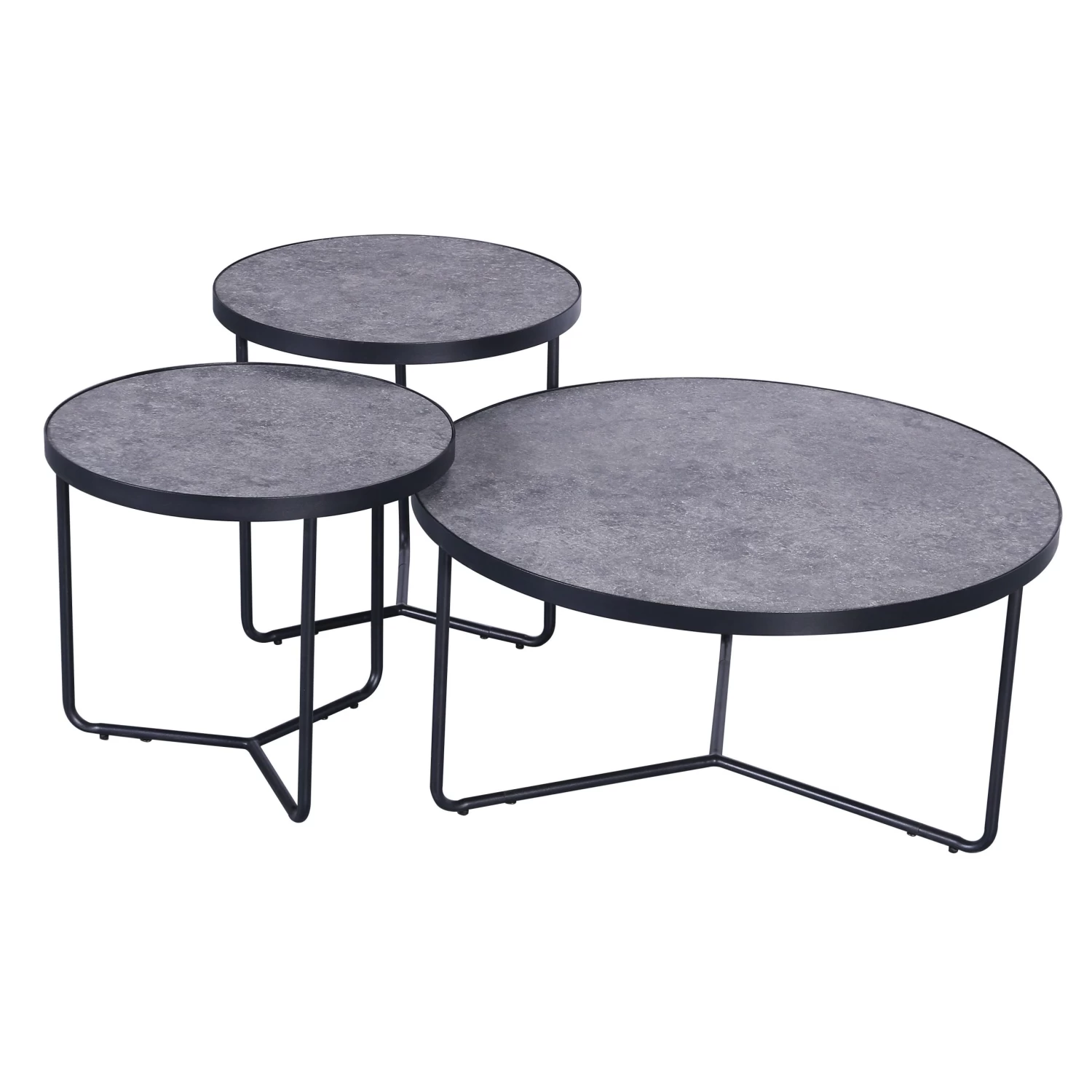 Deze stoere salontafel bestaat uit één grote tafel met een diameter van 80 cm en twee kleinere tafels met een diameter van 50 cm. De drie tafels hebben elk een andere hoogte en kunnen speels naast elkaar geplaatst worden.