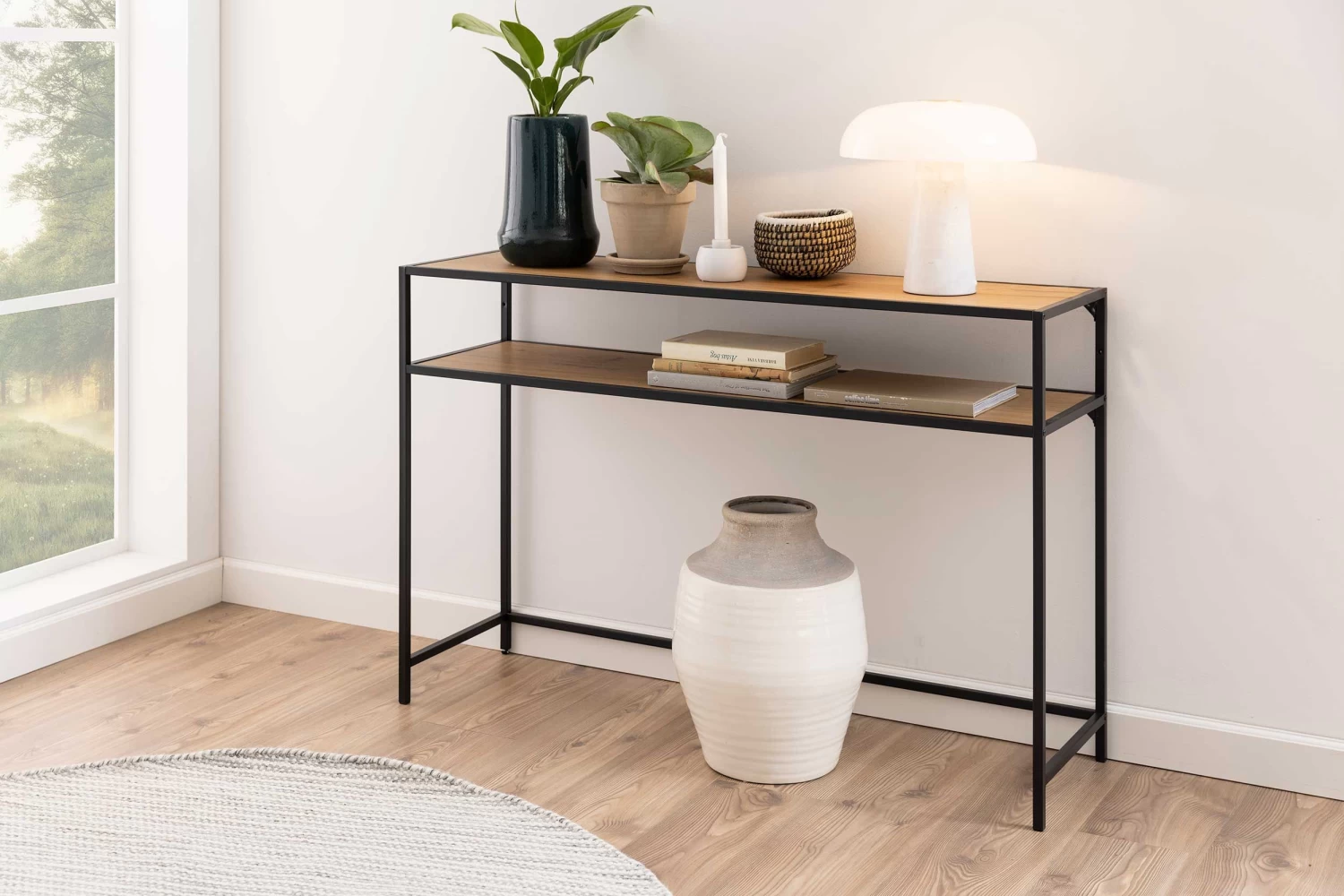 Met de meubelen uit de Dover collectie richt je je huis in volgens de laatste trends. Deze stoere sidetable heeft een frame uit zwart gepoedercoat metaal en legplanken met een decor van wilde eik. De sidetable is perfect om je hal of woonkamer aan te kleden met wat leuke decoratie. Tip: plaats een schaaltje op het meubel waarin je je sleutels kunt achterlaten.