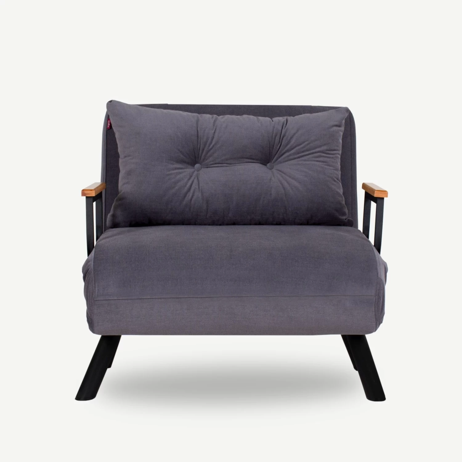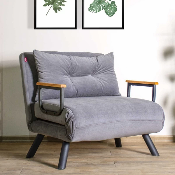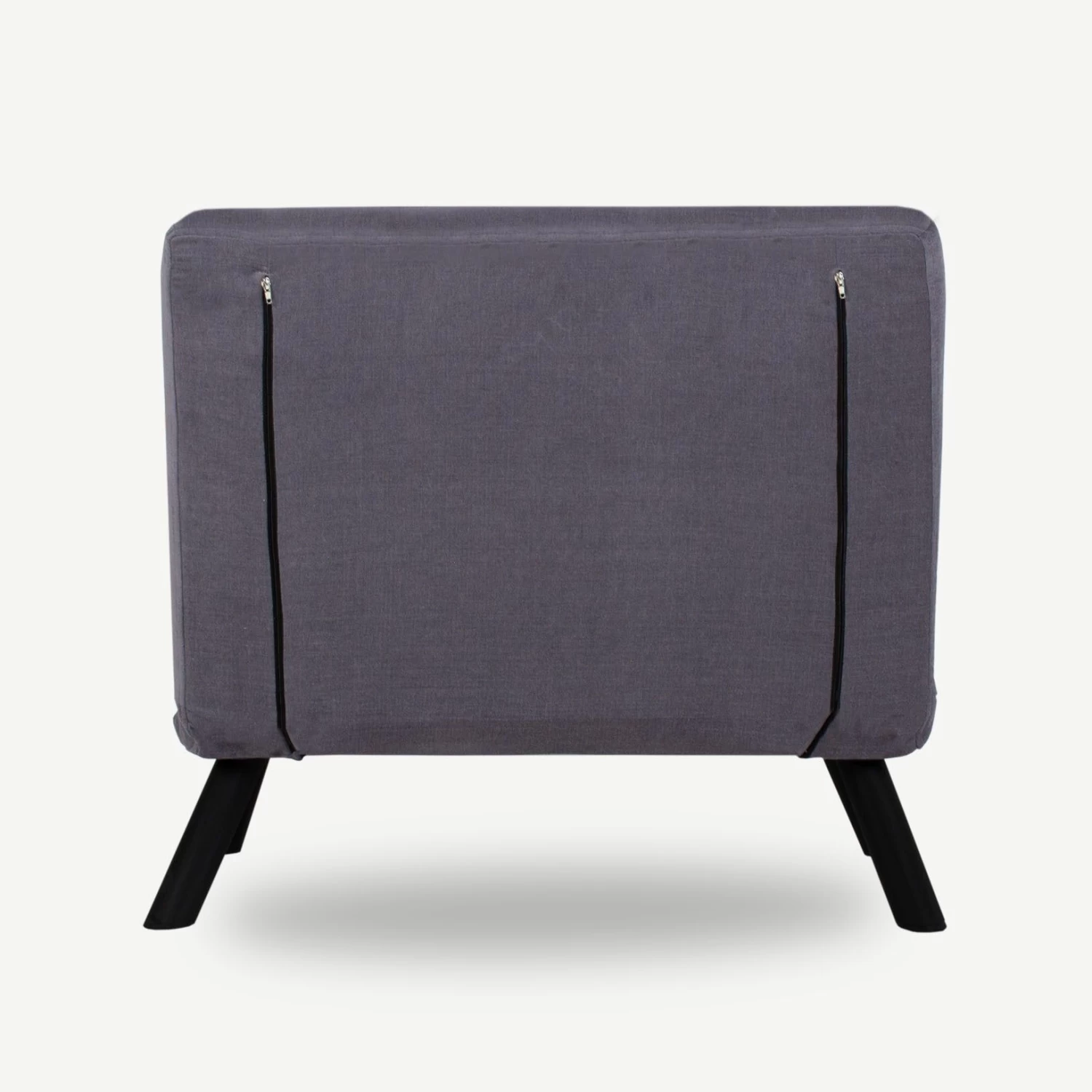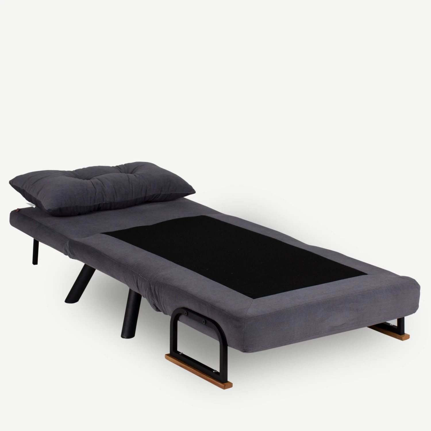 Slaapbank Angela heeft een zwarte metalen frame en een polyester bekleding. Het zit- en rugkussen is gevuld met schuim.