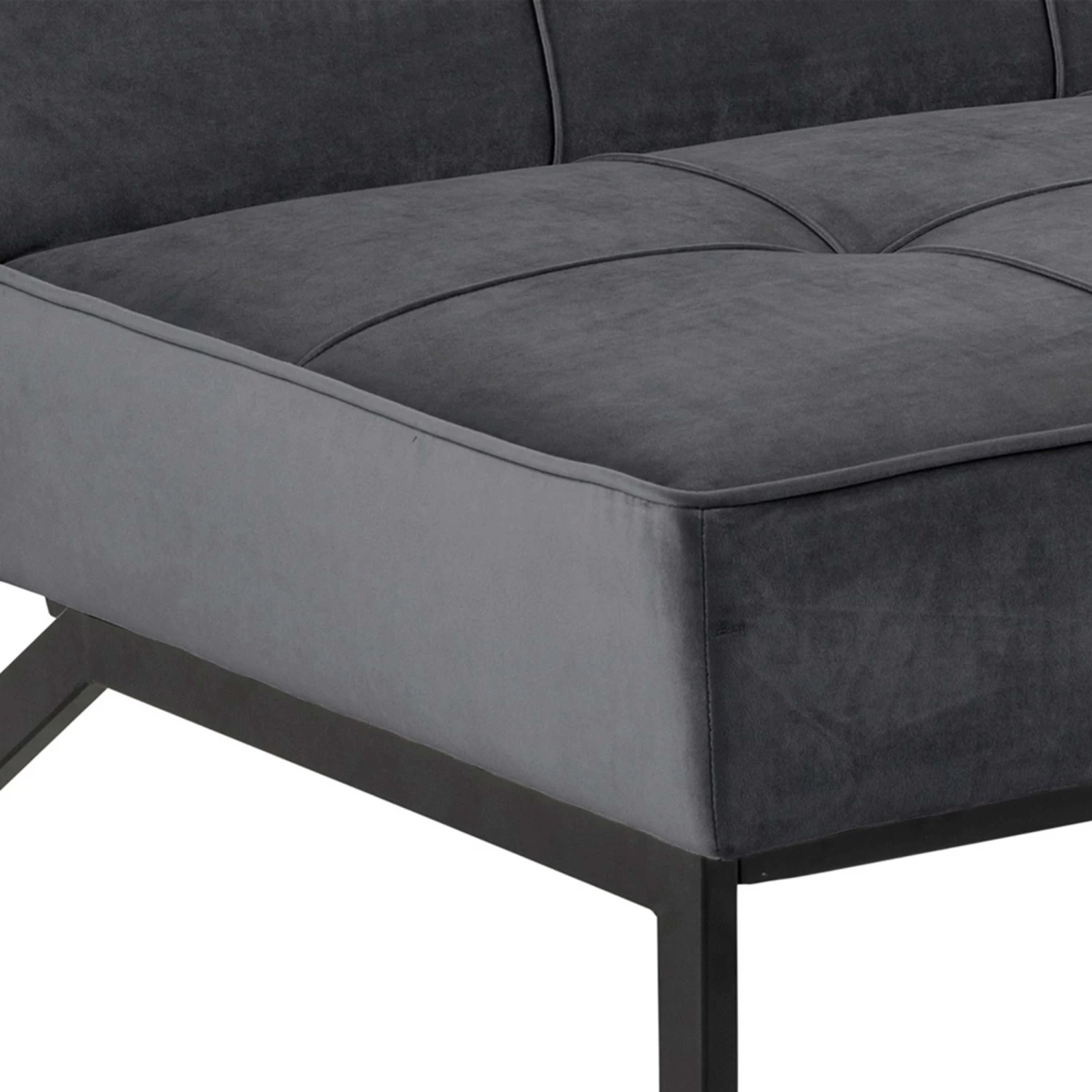 Slaapbank Giovanni met donkergrijze, fluwelen bekleding en zwart onderstel.
