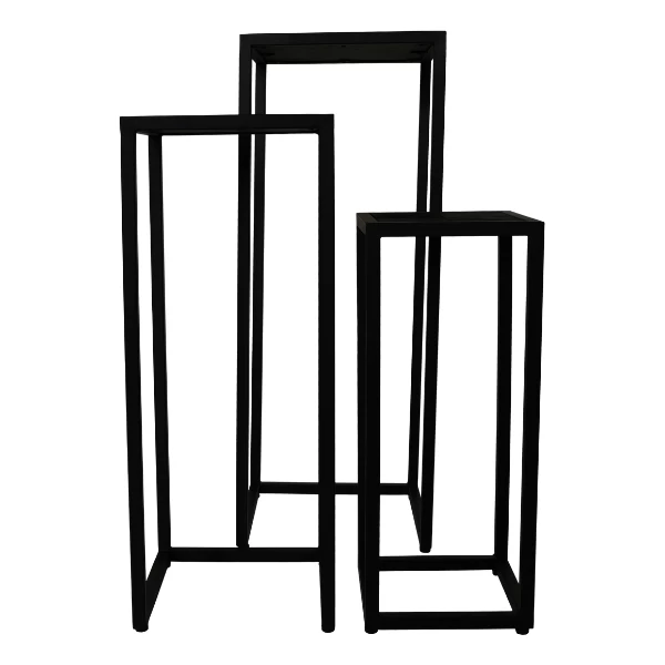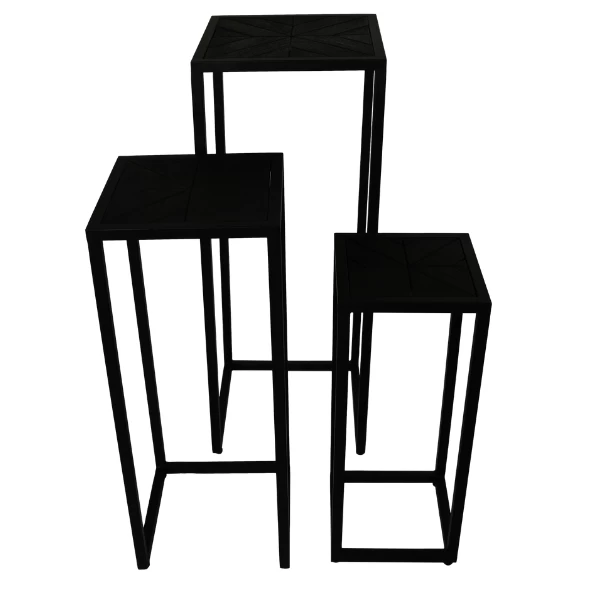Deze sokkels met een luxueus design passen perfect in een strak en industrieel interieur. De tafels bestaan uit mangohout en een stevig metalen frame. Het tafelblad is afgewerkt met een front in zwart mangohout met visgraatmotief. De grootste tafel heeft een tafelblad van 35X35cm en een hoogte van 90cm. De middelste sokkel een tafelblad van 30X30cm en een hoogte van75cm. De kleinste tafel heeft een tafelblad van 25X25cm en een hoogte van 60cm.
