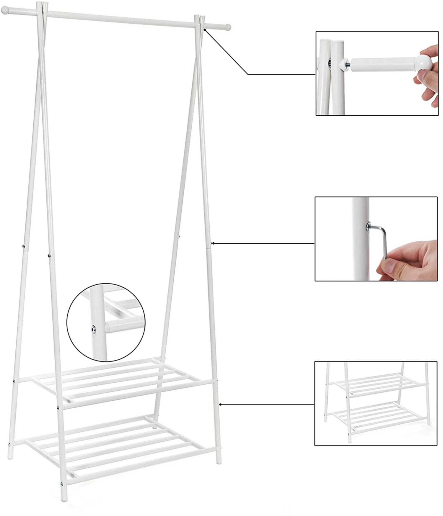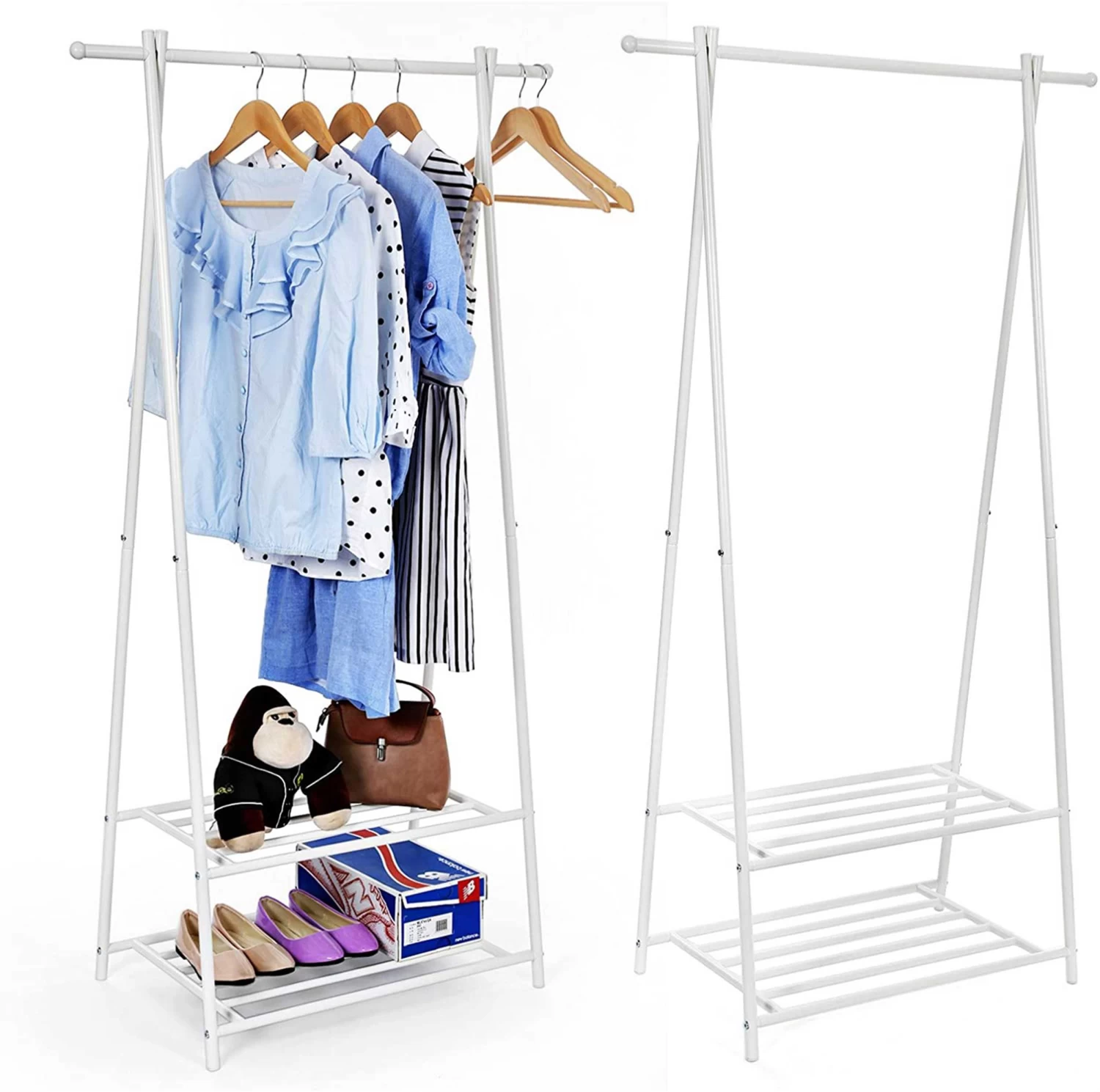Houd je garderobe netjes en opgeruimd met deze SONGMICS kapstok. Een volledig metalen A-vormig frame en twee planken van 2 niveaus bieden stabiliteit en ruimtebesparende opslag voor schoenen, manden en meer. Makkelijk te installeren met de instructies en inbussleutel erbij. Perfect voor slaapkamers, ingangen en kantoren!