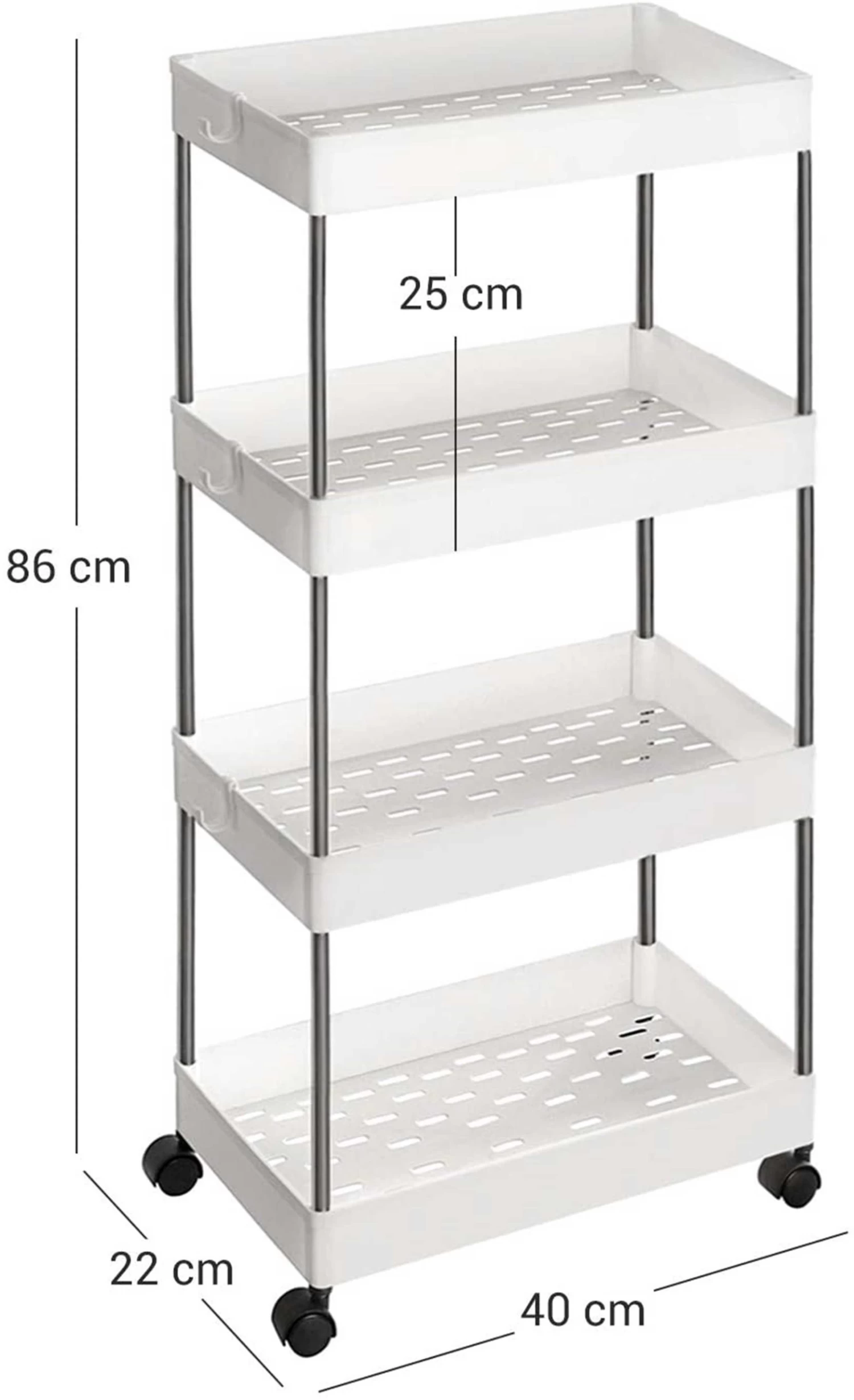 Maak een einde aan de rommel! 4-Tier Opbergwagen met PP Planken en Universele Wielen voor eenvoudige mobiliteit. Perfect voor keukengerei | kantoordocumenten | badkameropslag. Maximale capaciteit: 20 kg totaal (5 kg per plank). Afmetingen: 40x22x86cm. 6 haken voor het ophangen van keukengerei enz.