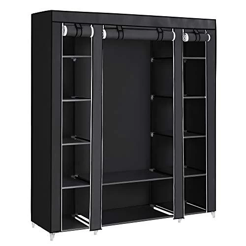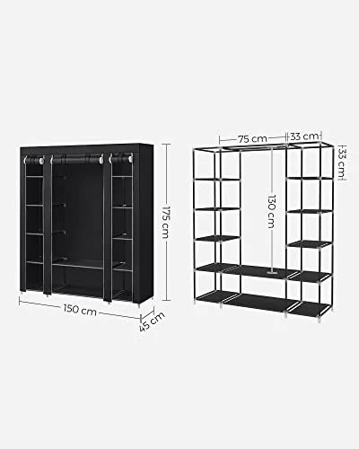 Draagbare kledingkast met ophangrail, planken en stoffen bekleding. Grote capaciteit, gecategoriseerde opslag, grote sterkte, eenvoudige montage. 150 x 45 x 175 cm. Zwart