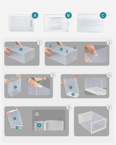 K.O. de rommel met dit pak van 18 klassieke schoenendozen! Transparant en wit, met een doorzichtige voordeur voor een blik in de toren van schoenen en een stapelbaar en opvouwbaar ontwerp voor maximale opslagruimte. UK maat 12. Opzetten is een fluitje van een cent; stapel ze op elkaar voor ademende orde. Pak de chaos van schoenen opbergen aan en blijf in stijl!