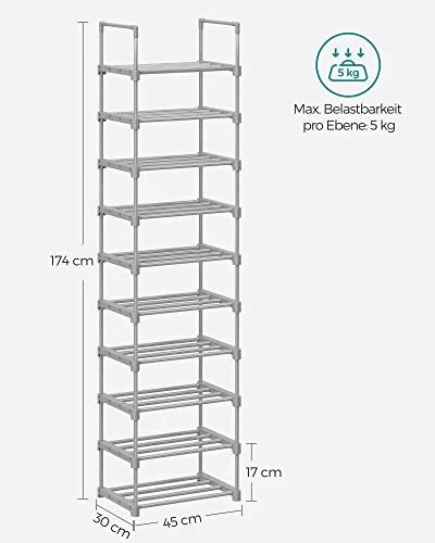 Het schoenenrek is een metalen schoenenopberger met 10 etages en een aanpasbaar ontwerp, die voldoende opbergruimte biedt voor 20 paar schoenen. Het is gemaakt van robuuste metalen buizen en kunststof verbindingsstukken, waarbij elke etage tot 5 kg kan dragen. Het rek is ruimtebesparend, eenvoudig te monteren zonder gereedschap en kan in verschillende vormen worden gemonteerd of in twee kleinere rekken worden opgedeeld voor gebruik in verschillende kamers. De afmetingen zijn 30 x 45 x 174 cm en het wordt geleverd in een strakke grijze kleur. Het pakket bevat een anti-tip kit en instructies in meerdere talen.
