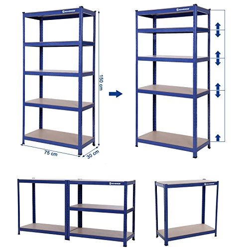 Stalen stellingkast met 5 etages | Montage zonder gereedschap | 650 kg draagvermogen | Garage, berging | 30 x 75 x 150 cm | BlauwZware en stabiele stellingkast met verstelbare planken, deelbaar en belastbaar tot 650 kg. Inclusief montage zonder gereedschap en anti-tip kit: 150 x 75 x 30 cm | MDF Formaat: 75 x 30 cm, 6,2 mm dik | Dikte metalen frame: 0,7 mm | Inclusief 1 opbergrek en instructies.
