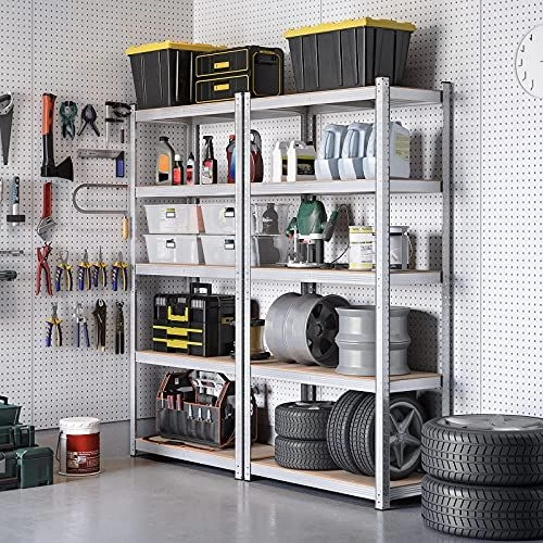 Stalen stellingkast voor zwaar gebruik met verstelbare legplanken en deelbaar frame, belastbaar tot 600 kg; eenvoudig te monteren constructie zonder gereedschap met anti-tip kit voor extra stabiliteit. Perfect voor garage, kelder, schuur of bijkeuken