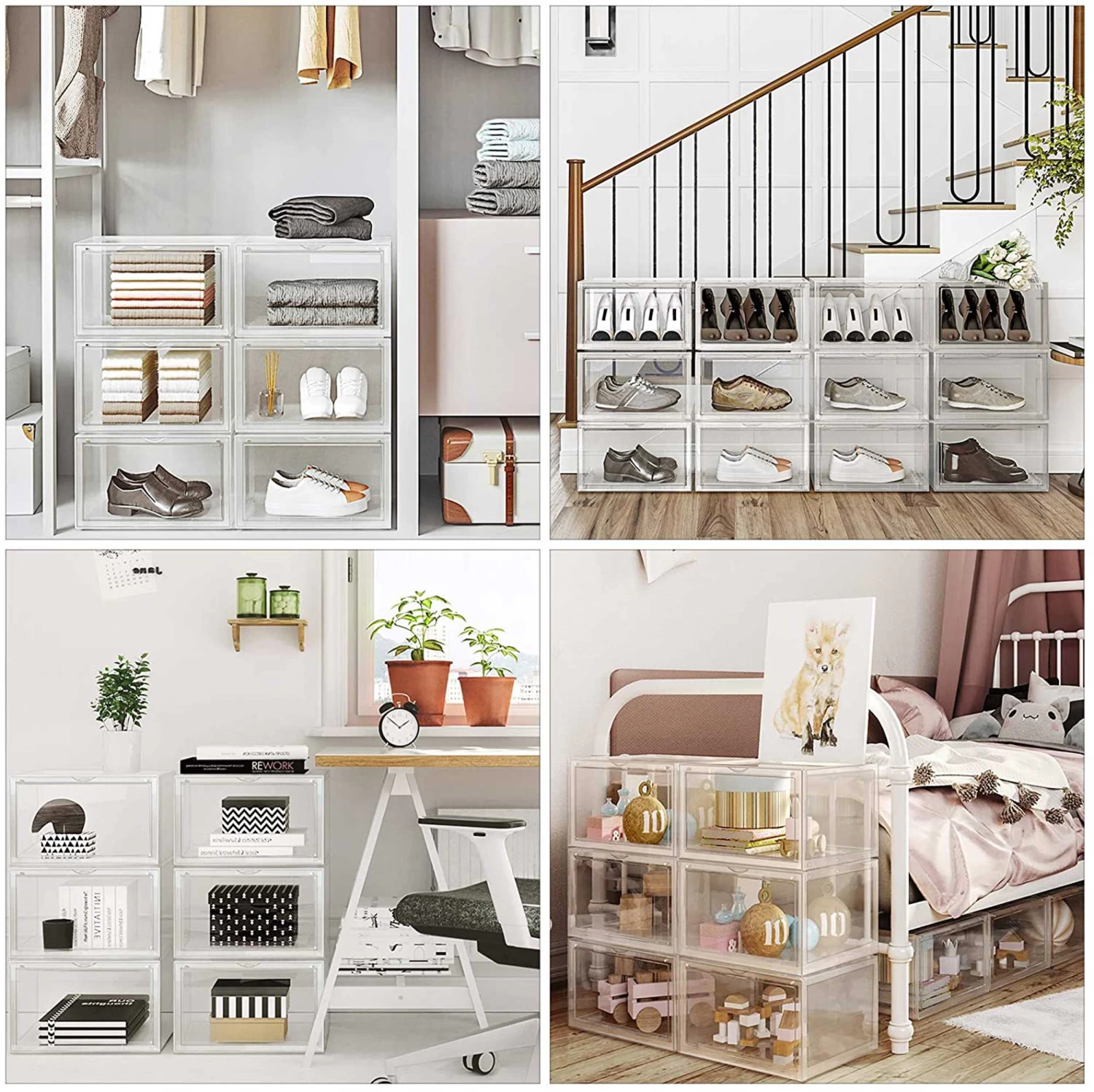 Organiseer en bescherm je schoenen met dit pakket van 6 stapelbare schoenendozen. Met een doorzichtige deur en groot voorvenster zijn je schoenen altijd goed zichtbaar. Het stapelbare ontwerp en de stevige constructie maken deze dozen perfect voor schoenen met maat 11. Elke doos wordt gedemonteerd geleverd met duidelijke instructies voor eenvoudige montage. Deze schoenendozen zijn gemaakt van hoogwaardig plastic en gaan dus lang mee.