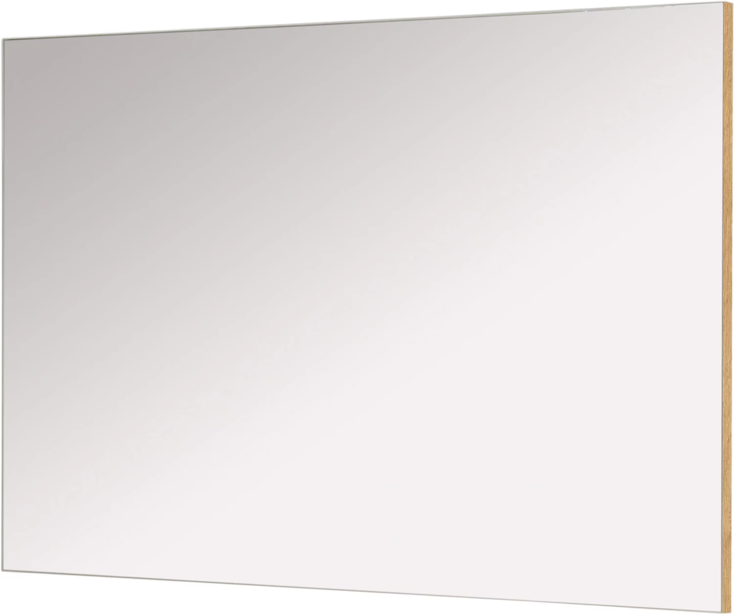 Spiegel Castor die rust op een draagplaat in spaanplaat. Zijkanten van de spiegel in eikdecor, voorzien van een laagje melamine.
